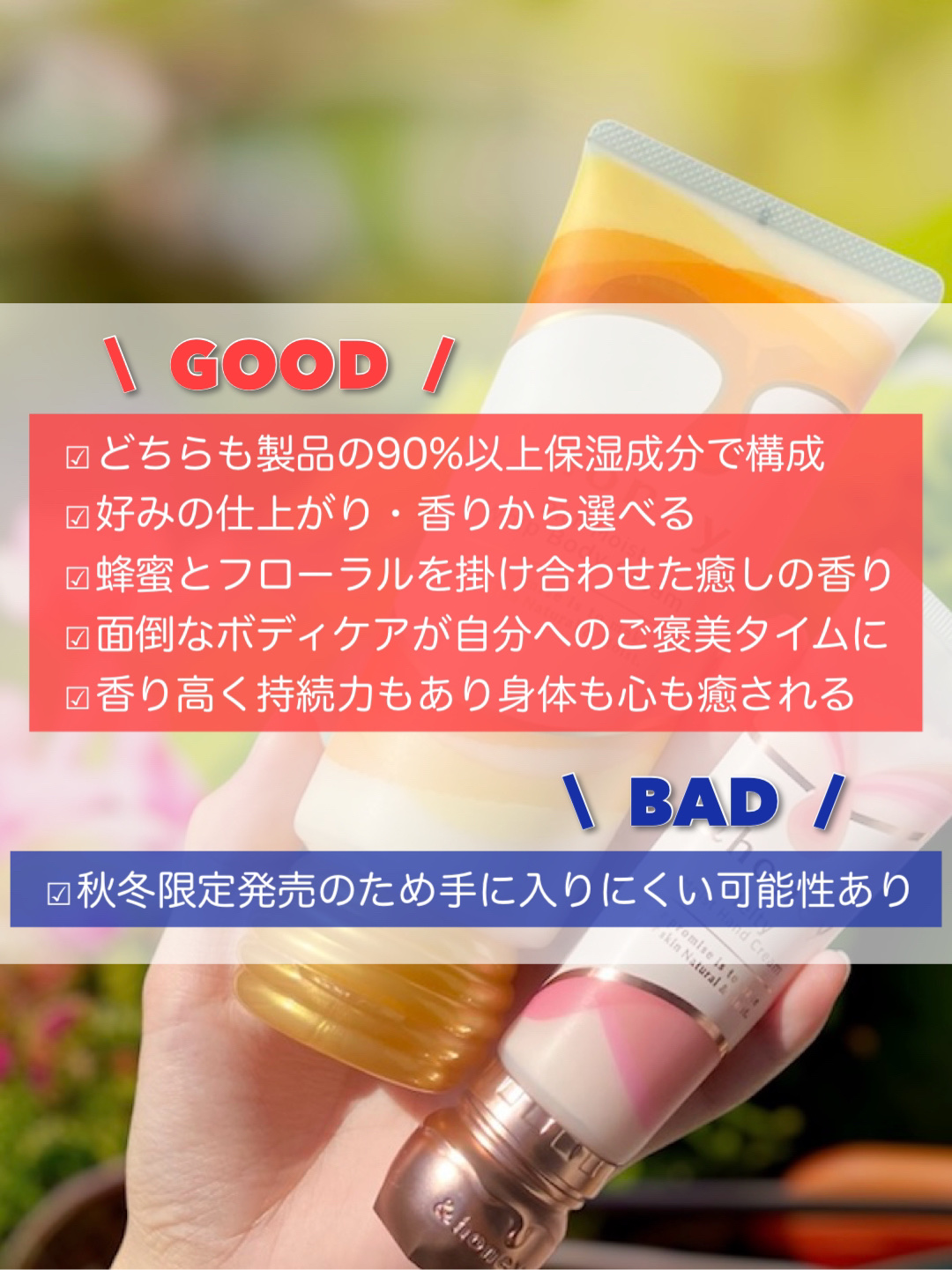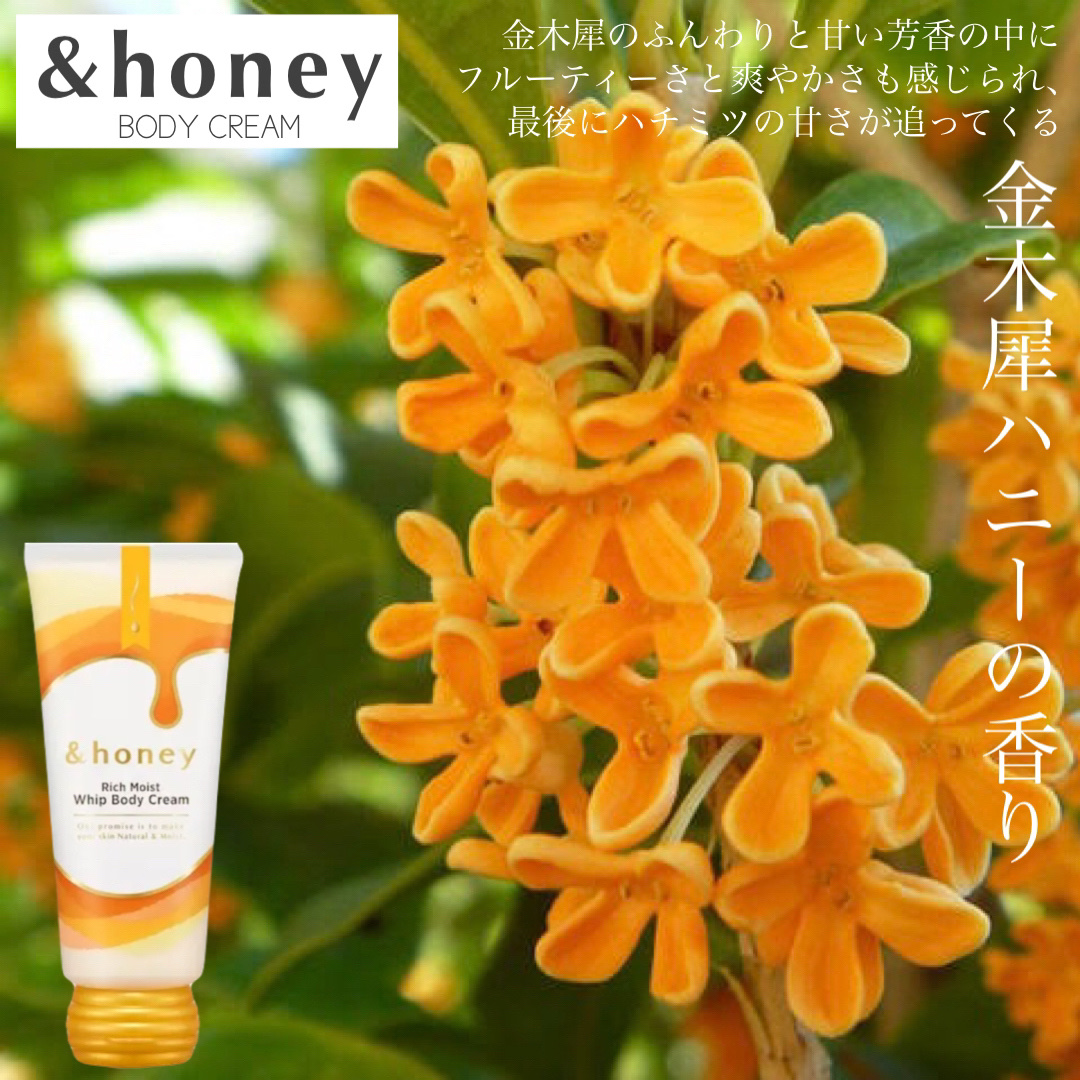 ボディケア、ハンドケアが楽しくなる☺️💕✨ 香りと一緒にしっかり保湿ケア❣️ 金木犀ハニーの香り🍯 クリームは柔らかく伸びが良いです。しっかり乾燥ケアができるくらいしっとりですが嫌なベタつきが残ることはないので使いやすいです。 ハチミツ美容成分でケアできます✨