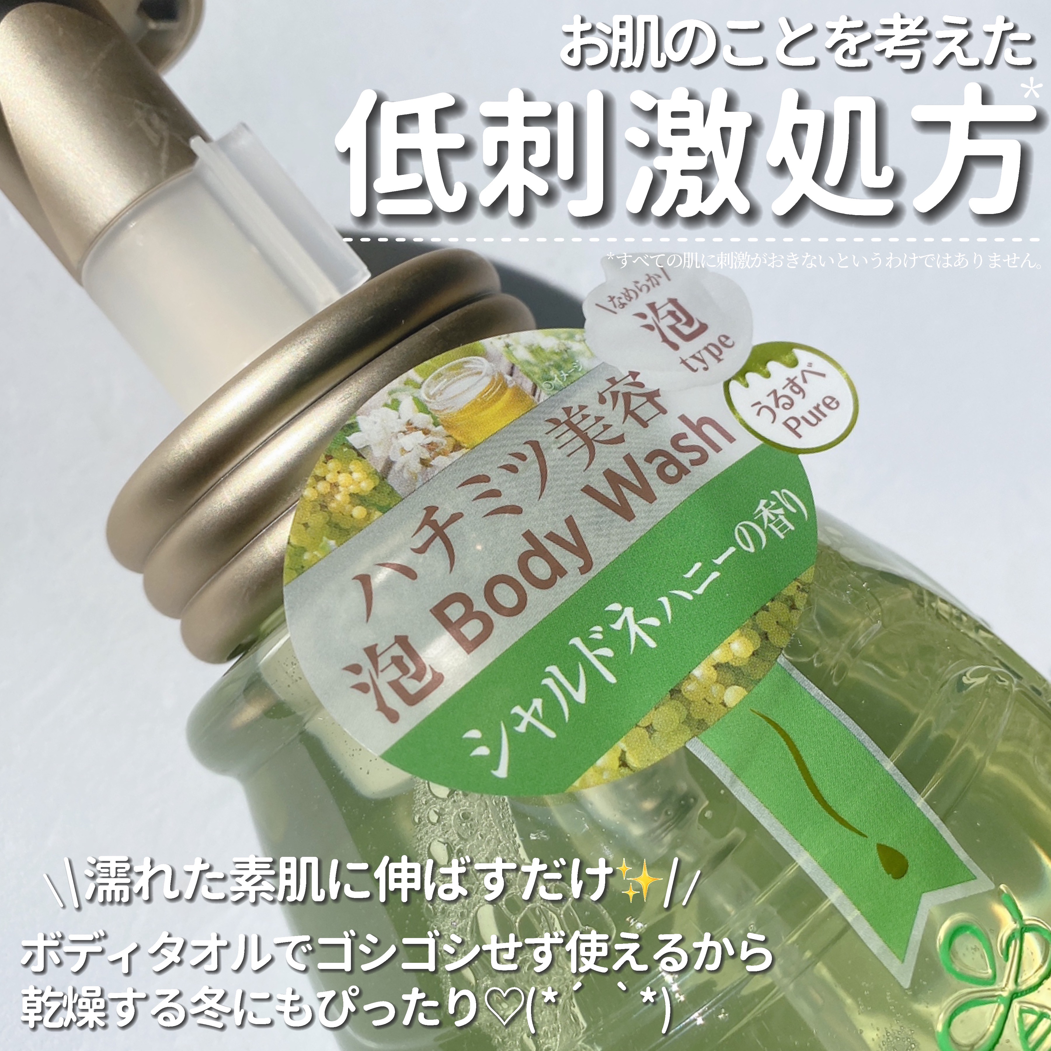 - ハチミツ美容でうるおいを残しながら、 キメ細かくなめらかな泡がやさしくすべすべに洗い上げる泡ボディウォッシュ。 製品の90%以上をハチミツ*1をはじめとして、高保湿ヒアルロン酸*2・アルガンオイル*3などのうるおい成分※1で構成※2し、さらに8つの無添加・フリー処方※3で、「低刺激性処方」を追求しました♡ みずみずしく上品なシャルドネハニーの香りでバスタイムを至福のひとときへ ▼泡ボディがおすすめの方🍯 ○お肌を優しく労わりながら洗いたい方 ○すべすべな仕上がりが好きな方 ○シャルドネの香りが好きな方 サルフェート(ラウレス硫酸Naなど)・鉱物油・アルコール・石油系界面活性剤・ 合成着色料・シリコン・動物実験・防腐剤フリー ※1 保湿・整肌成分の総称 ※2 基剤を除く、水を含む ※3 サルフェート(ラウレス硫酸Naなど)・鉱物油・アルコール・石油系界面活性剤・合成着色料・シリコン・動物実験・防腐剤 *1 保湿 *2 アセチルヒアルロン酸Na(保湿) *3 アルガニアスピノサ核油(保湿)