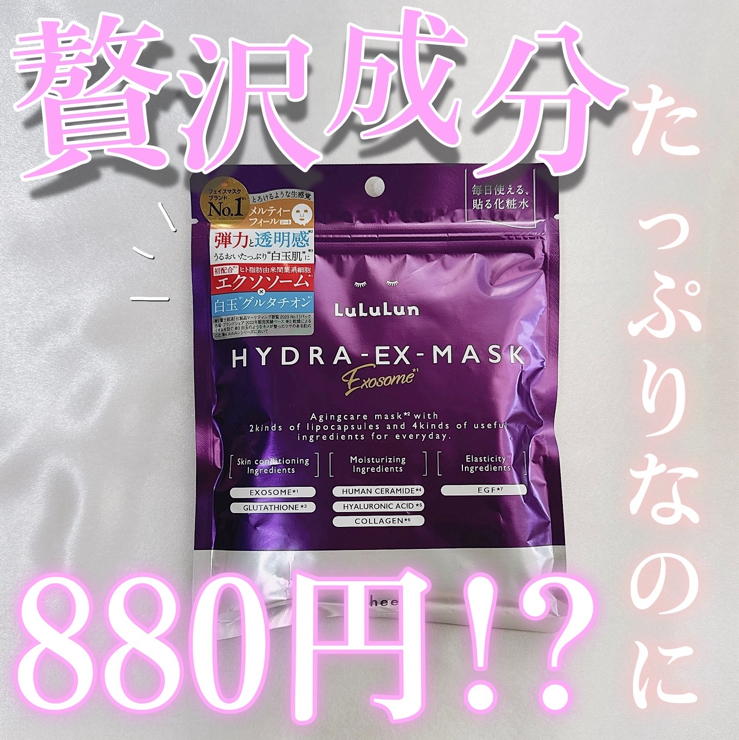 - ルルルンハイドラシリーズから新登場。うるおいにプラスするのは、「エクソソーム*1」。先端再生テクノロジーにインスパイアされた、デイリーエイジングケア※1マスクです。白玉※2グルタチオン*2をプラス配合し、弾力・透明感※3・つやめきのあるなめらかなお肌へ導きます。 (*1 整肌成分 ヒト脂肪由来間葉系細胞エクソソーム *2 整肌成分 グルタチオン、アルブチン、レシチン ※1 年齢に応じて肌へうるおいと弾力を与えるケアのこと ※2 白玉のようなキメが整ったツヤのある肌のこと ※3 うるおいを与えて、乾燥によるくすみを防ぐ)