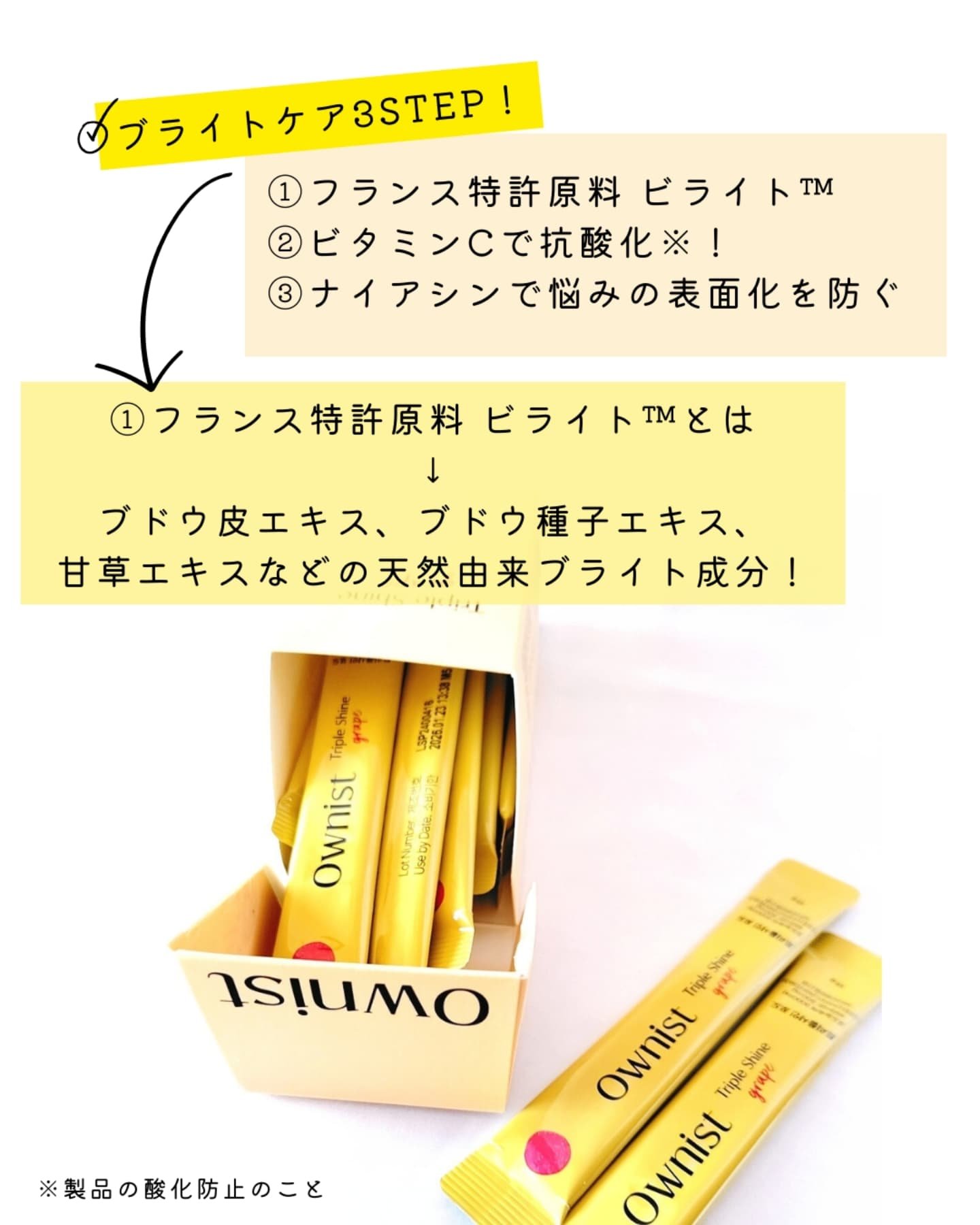 Ownist(オニスト)は、韓国で有名なデパートThe Hyundaiや免税店でも販売されてるインナービューティーブランド✨ オニストの商品はすべてプレミアム原材料を使用!原産地もクリアに明記されていて安心して摂取できるのが嬉しい🫶 シミやそばかすの原因となるメラニンを3ステップケア!ビライトTM、ナイアシン、ビタミンC、ビタミンB5が1包にイン✨