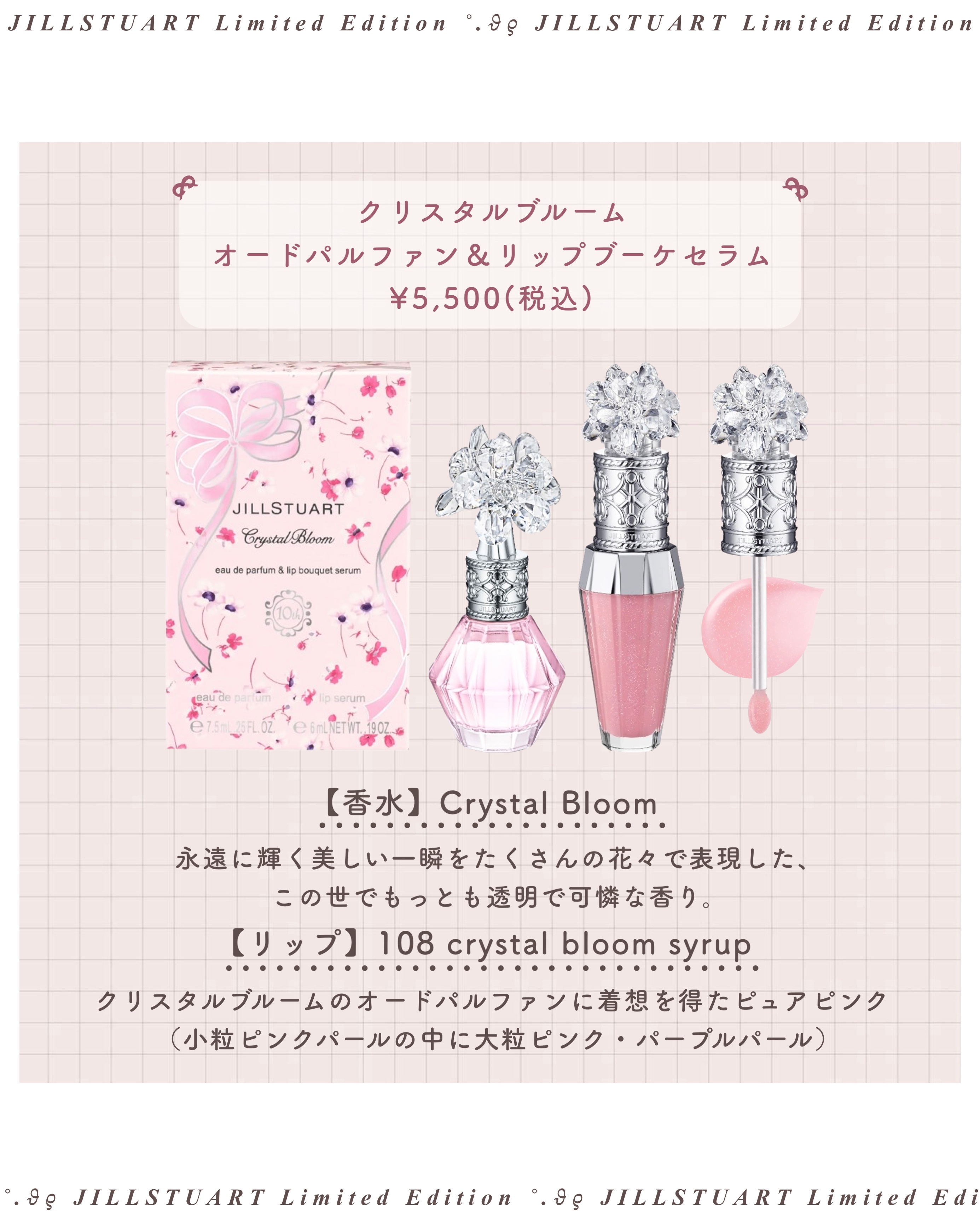 3種類から選べる、ホリデー限定ギフトセット✨ ジルスチュアート クリスタルブルーム オードパルファン & リップブーケ セラム セットでお得で可愛い🥹❤️ ちょっとしたプレゼントにもよさそうです🥰 2024年11月15日発売 限定品 2024年11月8日 予約開始