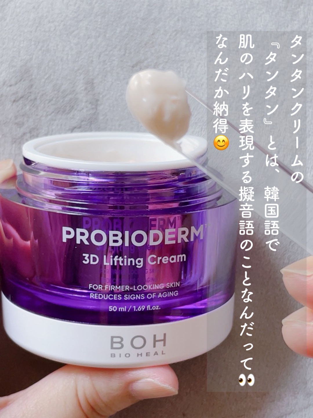- プロバイオダーム™ 3D リフティングクリーム ・既存のタンタンクリームが、より一層のハリ弾力ケアができる商品としてパワーアップ※! ★プロバイオダーム™ 3Dリフティングクリームリニューアルポイント★ ①BIOHEAL BOHが厳選した乳酸菌*のみ配合した独自保湿成分!「プロバイオダーム™」 BIOHEAL BOHの厳しい審査のもとに選び抜かれた肌バリアをサポートする独自の乳酸菌*でハリ弾力ケアを! →キーワード #ハリ活乳酸菌 *厳選した乳酸菌:ラクトバチルスプランタラム&ラクトバチルスラムノサス&ラクトバチルスロイテリ(全て保湿) ②肌本来の弾力維持に欠かせない成分をプラス!肌が持つ成分を補うことで、ふっくらうるおった肌のハリ感をキープ ③ペプチドが12種から17種に!肌バリアを形成。素肌をすこやかに保ちます。 ・もちっと密度の高いクリームで保湿&ハリケア。 バイオヒールボ独自の技術で肌表面をピンとハリをあたえ、よりハリ感が得られるテクスチャーを実現 ・3Dと訴求しているように、ふっくらうるおい感のある多面的な弾力ケアができることから、韓国語でしっかりハリのある様子を表現するタンタン(탄탄)のワードと組み合わせて「3Dタンタンシクリーム」という愛称ができました。 ・もちっと密度の高いクリームで弾力のある素肌に導くエイジングケア※2クリーム。 ※同商品リニューアル前に比べて ※2年齢に応じたケアの事