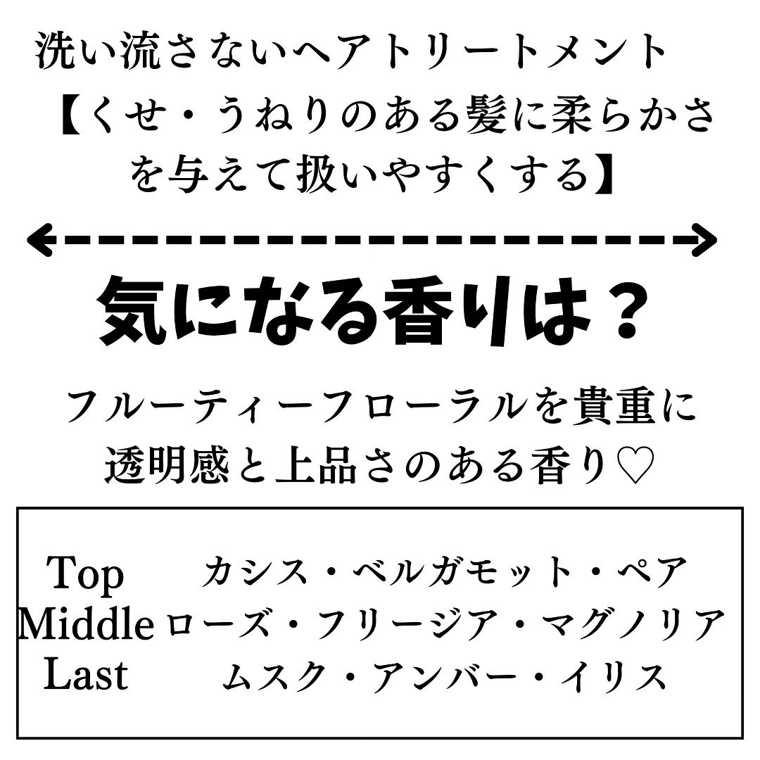 フルーティフローラルの甘さが少し入った上品な香りで美容室でお手入れしてもらったあとの超無敵な香りがします◎ 使った後の仕上がりが全然違います😂 猫っ毛でも、ダメージ毛でもサラッと柔らかい髪に大変身です お風呂上がりに本品を塗ってドライヤーさえすれば、美容室でケアしたような髪になるので気分が上がります🌈