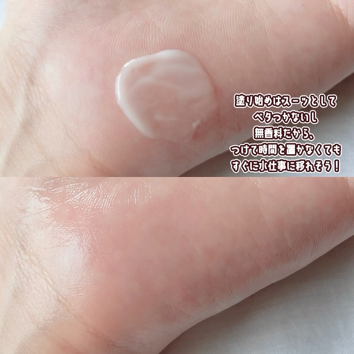 | 水仕事が多くて、何度も塗り直しができないときにも使えるハンドクリーム | 詳細を見る |