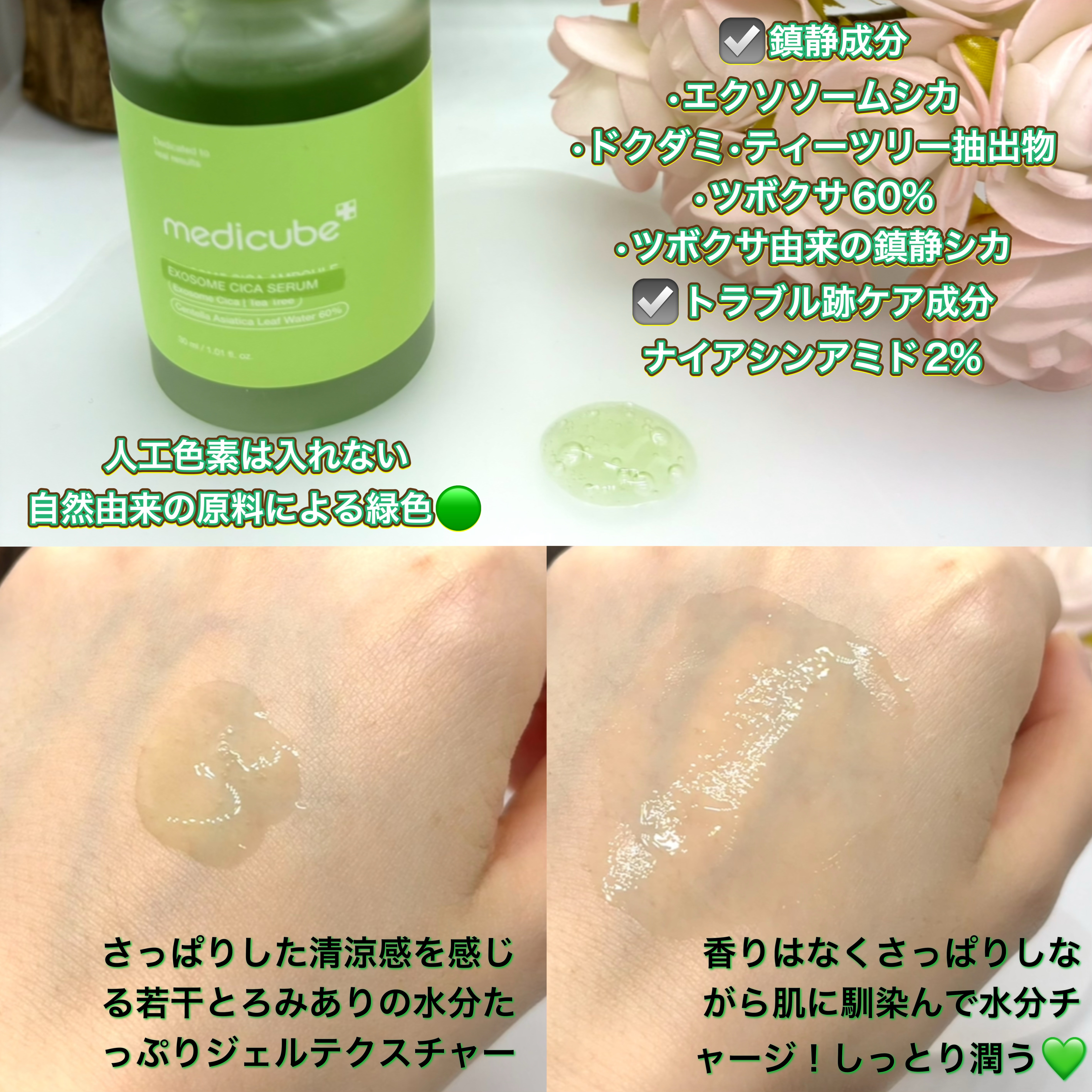 エクソソームで肌の鉄壁防御💪🏻🍃 新商品のエクソソームシカ4種 メディキューブのエクソソームシカは5.3倍強く 毛穴の510倍小さく毛穴にの隅々まで届く🍃 高濃縮な緑のジェルテクスチャー だけどサッパリしてベタつかないならデイリー使いにもオススメ🙆🏻♀️🍃🍃🍃