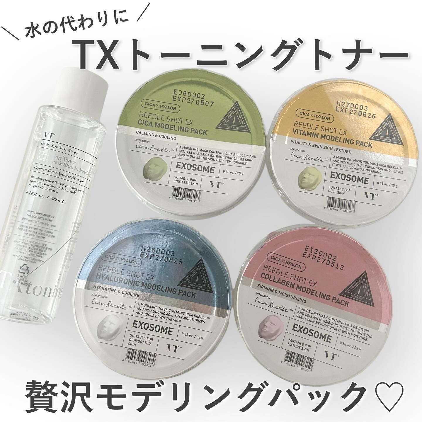 シカリードルとエクソソーム配合でそれぞれの有効成分をしっかりお肌に届けるモデリングマスク♡ 貼っている間はひんやりとした感じがとても気持ちよく、モデリングマスクが固まっていっても内側はぷるぷるのままなのもよかったです◎ TXトーニングトナー贅沢使いのモデリングマスク、控えめにいって最高でした…💫💫💫