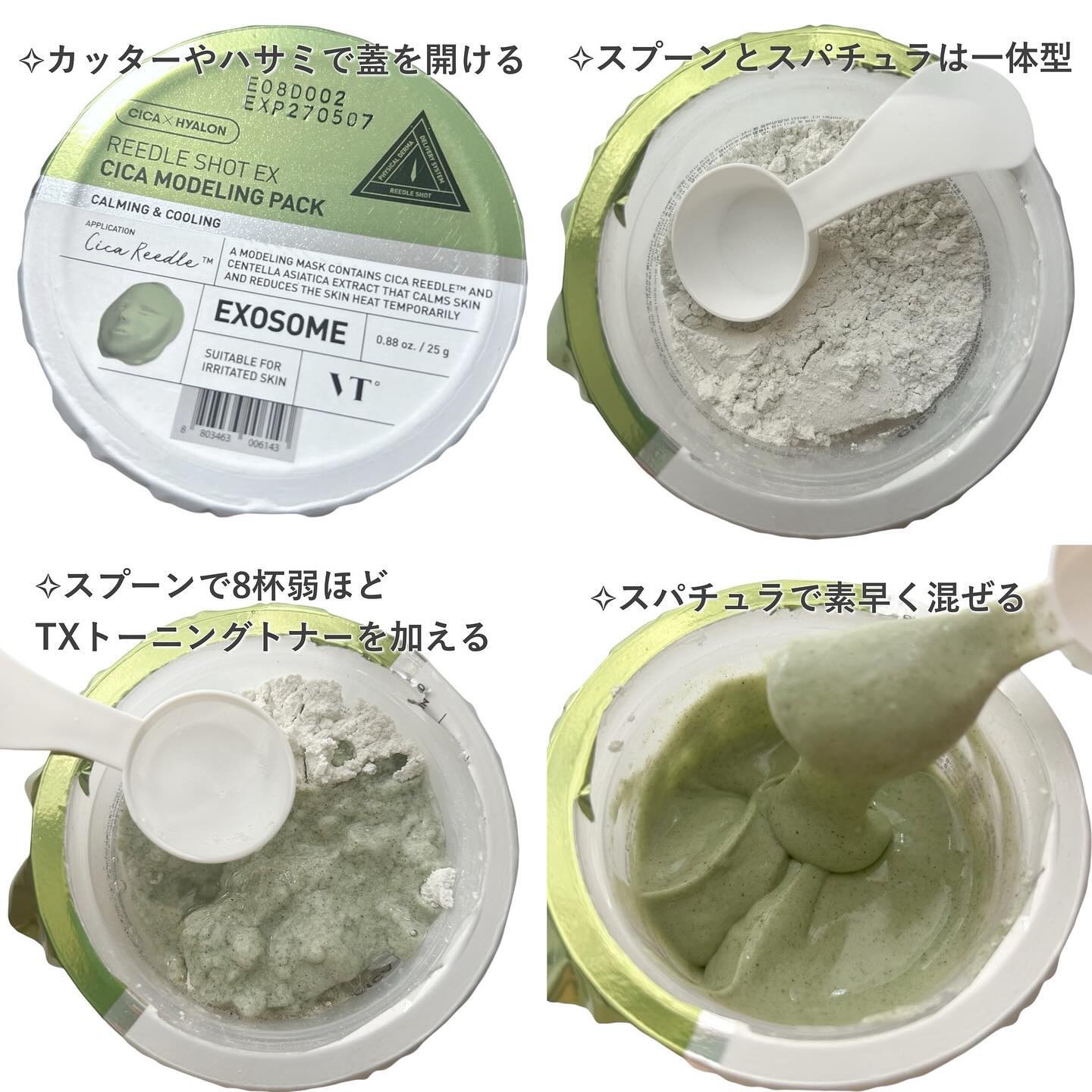 - 混ぜて作るラッピングパック!スキンケアの最後の段階に肌に塗り広げることで、パックが美容成分たちを角質層に送り込みます。さらに、剥がす際には肌の余分な皮脂・汚れを除去!肌悩みに合わせて全4種からチョイス! リードルショットEX CICAモデリングパックはVTの独自成分CICA REEDLE™*1+エクソソーム*2+CICA*3を配合。ゆらいだ肌にひんやりとした使用感で、肌の角質層までスキンケアの美容成分の浸透をサポートし、肌を整えます。贅沢スキンケア時間をお求めのあなたへ。 *1 ツボクサエキス(整肌)、シリカ(スクラブ) *2 ヒトサイタイ間葉幹細胞エクソソーム(保湿) *3 ツボクサ葉/茎(整肌)