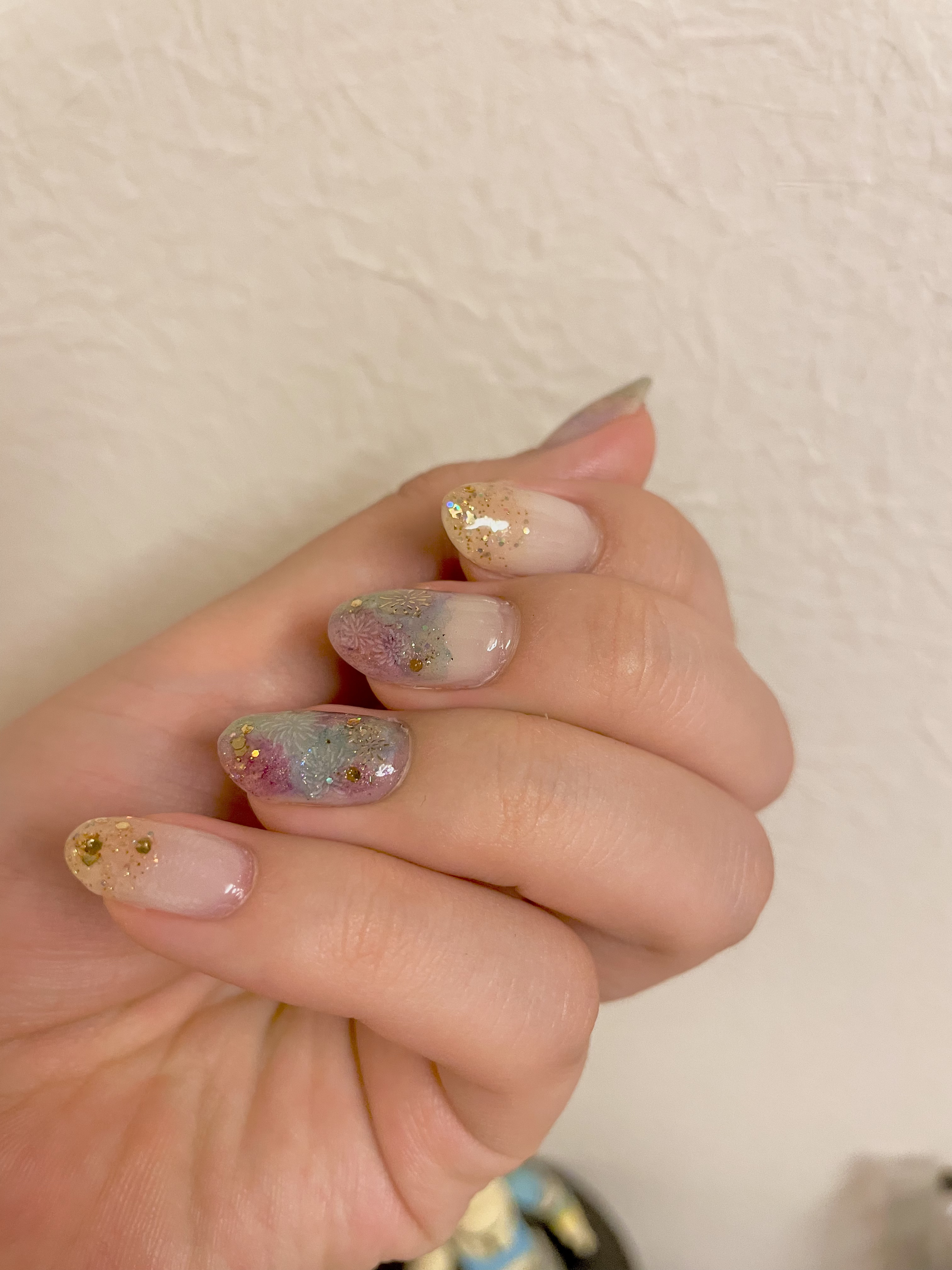 新しいネイルです🦄💜 使ったネイルシールが古くてぐちゃぐちゃになってしまった所がちらほらあって悲しいです😌 でも、結構可愛い仕上がりになったので満足です☺️使用ポリッシュ↓デュカート:ライラックスカイ095キャンメイク:FC01ナチュラルピ...