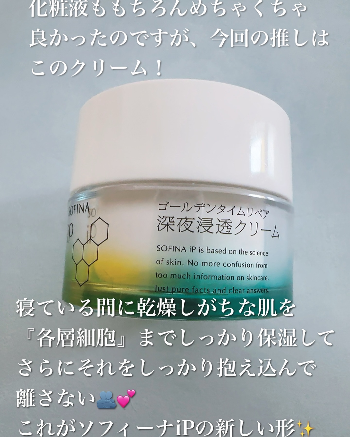 水々しいテクスチャーで、ばしゃばしゃ使える感じ香りはフローラル系の爽やかな香り 眠っている間に角層細胞まで夜間集中ケア 使用感はこっくりしたクリームなのに、肌にのせるとさっぱりしてベタつかないのに潤う 世界初成分アプローチで角層細胞までうるおい枯れしにくい