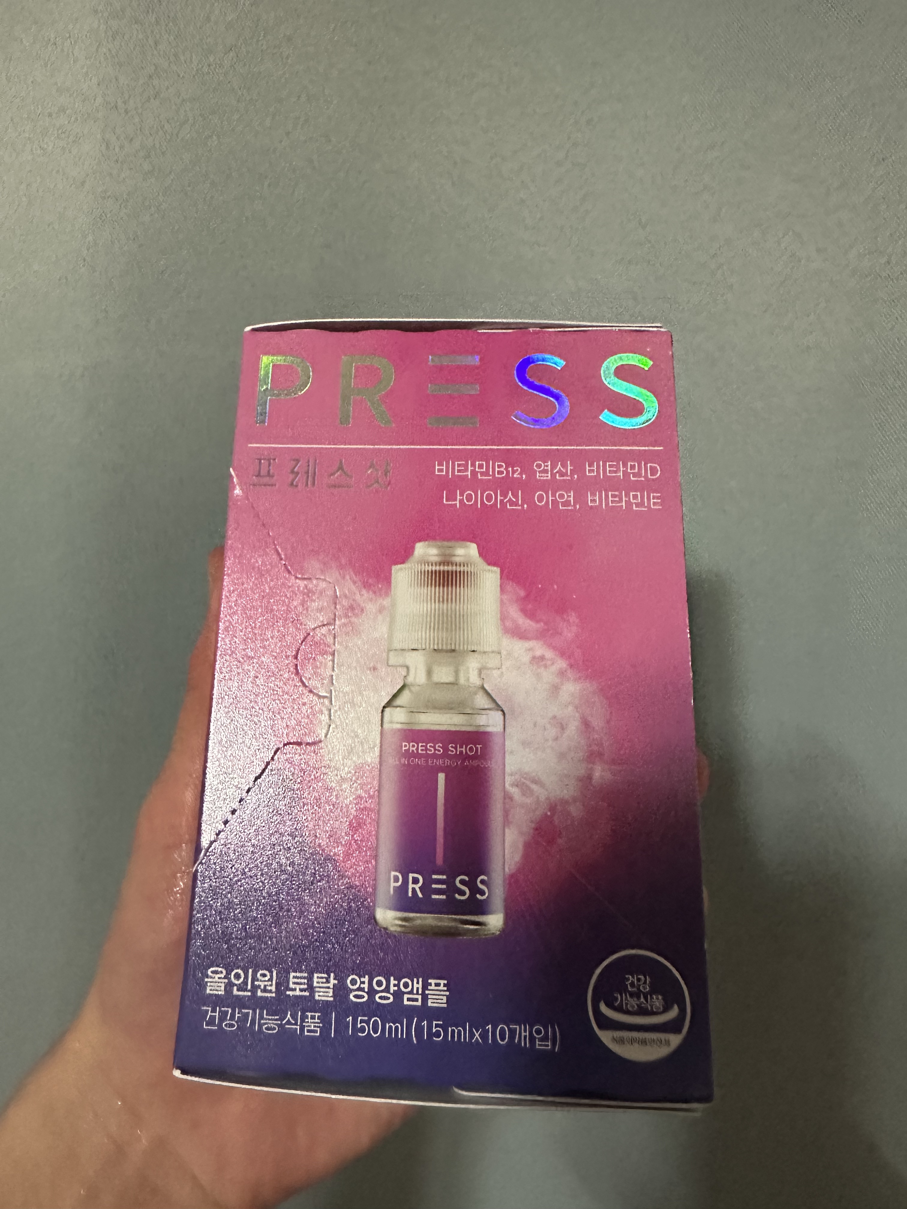 ビタミンB,D,E、葉酸、亜鉛、ナイアシンなどが配合されてるオールインワンエナジーアンプルです! 飲む直前にボタンを押して液体と粉末のビタミンを振るとピンク色に変化します✨ 味は甘いキャンディみたいな感じで、苦くないから飲みやすい!