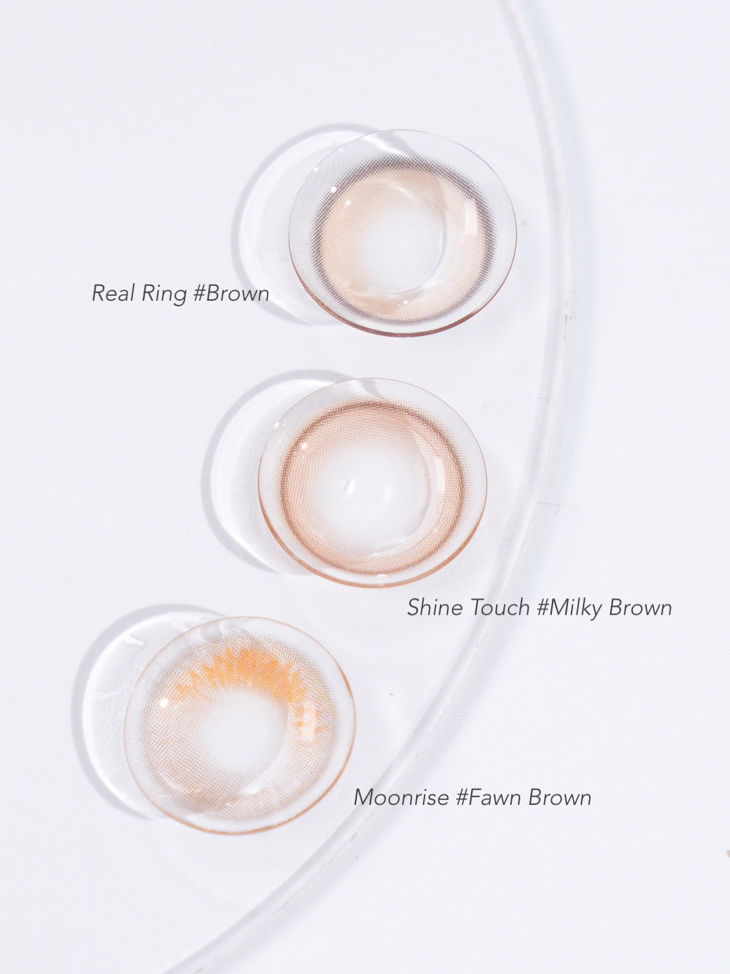 一番フチが太めだけど、ふわっとしたデザインなので きつい印象にならない! グレーみはしっかり感じることができる🩶 フチが細くてくっきりしてる! ガラス玉みたいにくりっとした印象に✨ 瞳の印象をはっきりさせたい人におすすめ 着色直径は一番小さめだけどくりっと見える! 比較すると、ベージュも混ざったような色に見えて グレージュカラーに近いイメージ♡