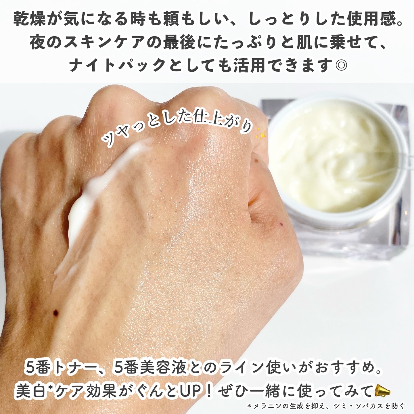 - 大人気『5番白玉グルタチオンCシリーズ』から待望のクリームが登場。 高濃縮グルタチオン*1とビタミン*2配合で、均一で透明感のある肌印象に導くクリーム。 べたつかない程よいしっとり感でお肌にピタッと密着してくれるのでスキンケア最後の段階でお肌にたっぷり塗ると睡眠パックとしてもご活用いただけます。 *1グルタチオン(整肌成分) *2アスコルビン酸、アスコルビルグルコシド、トコフェロール(全て整肌成分)