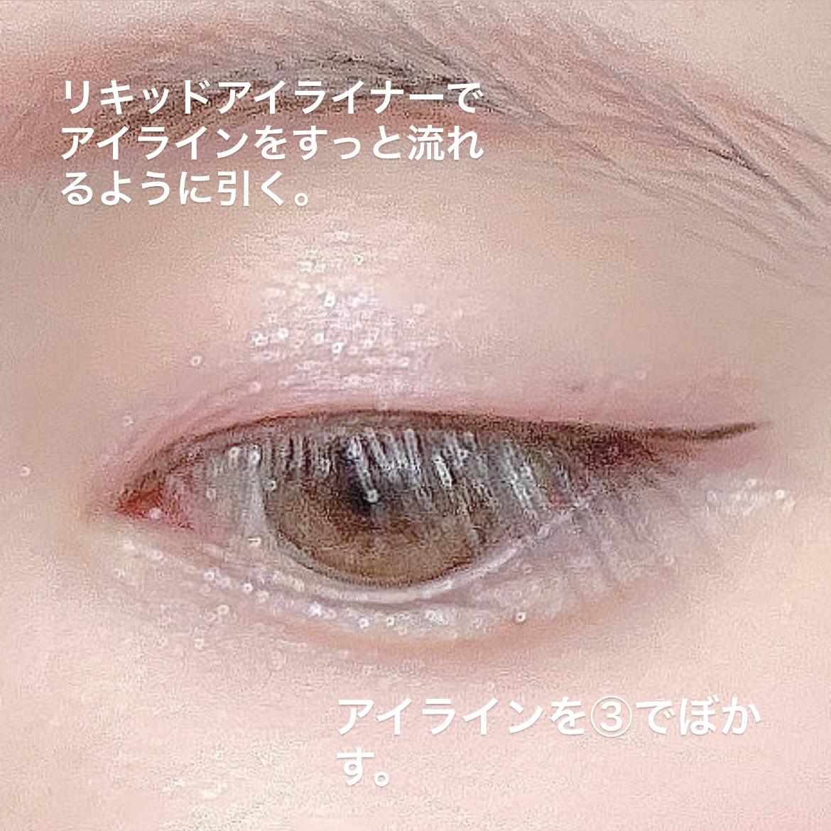 ただブラウンシャドウだけだと目がくすんで見えるタイプの顔をしているので、赤みブラウンをメインに使用しました。 つり目意識で跳ね上げラインを引く。ダークブラウンやブラックのリキッドアイライナーで長めに。 涙袋の影のラインを引き、涙袋にラメをのせる。