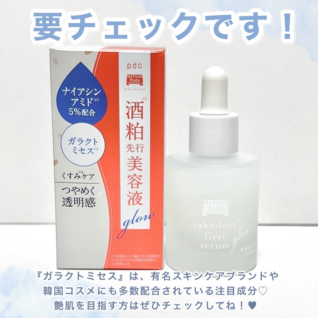 酒粕スキンケア商品を展開しているpdcのワフードメイド。新作としてこの秋冬に導入美容液が登場しました🤍 こだわりの酒粕エキス、3種の透輝肌サポート成分(保湿成分)を、ナイアシンアミド*1 5%、ガラクトミセス*3などうるおって透明感をアップさせる成分が目白押し! ほんのりとろみがあり、しっとりうるっとした使用感🩵 なじむと肌に吸い付くような保湿感を感じる使用感です。