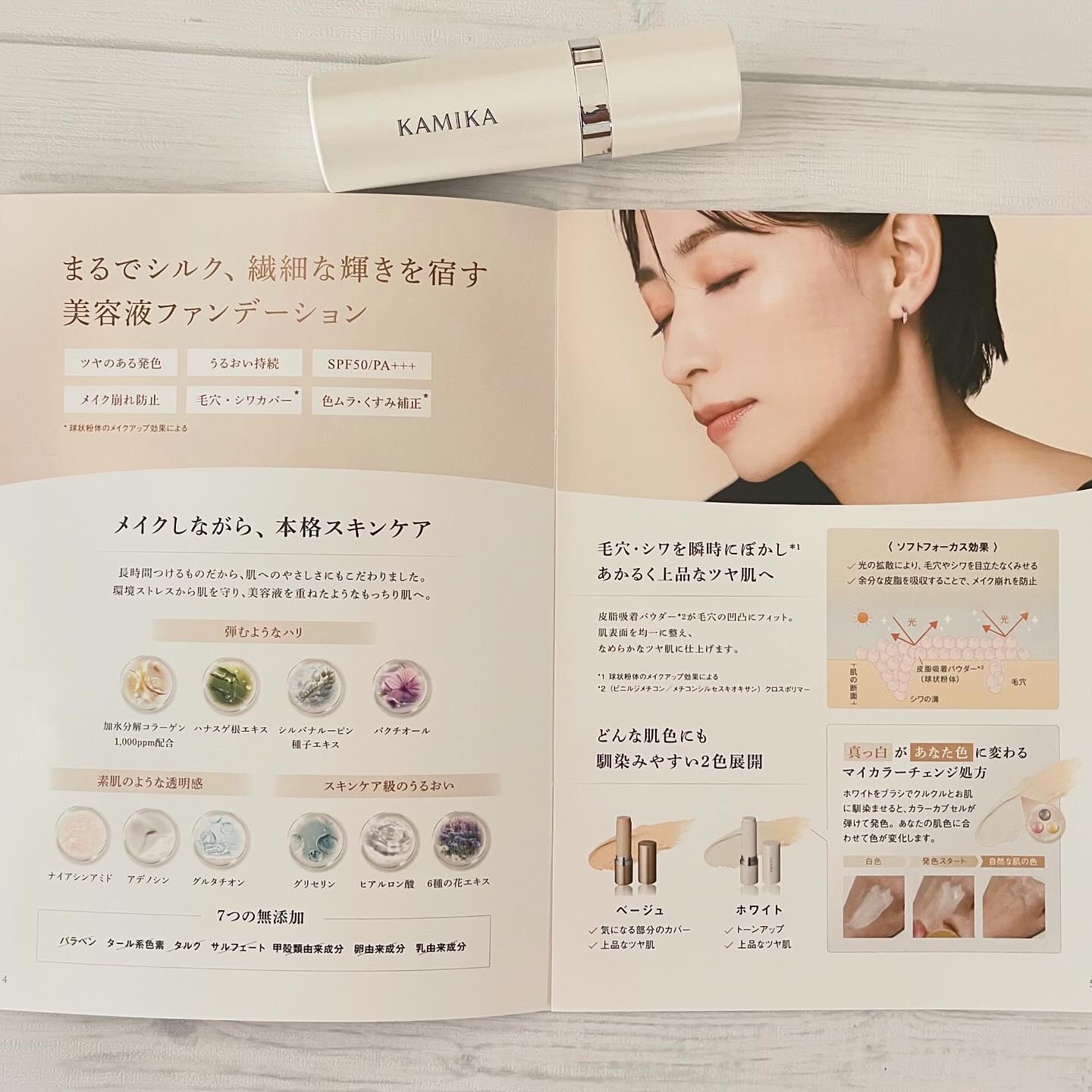 - SPF50/PA+++ 1本8役をこなす、優秀多機能スティックファンデーション 「手間や時間をかけるほどキレイになれる」そんな固定概念を、覆したい。KAMIKAは忙しい時も、余裕がある時も、どんな時でも変わらずに続けられるシンプルケアを提案します。 つけているほどに肌がキレイになるエイジング成分の実力 ファンデーションを長時間つけていることがストレスになってしまう人にも着目し、候低刺激はもちろん、つけていたほうが心地よいと感じるファンデーションを目指しました。それはまるで、日中ずっとトリートメントしている感覚のファンデーション。肌を確実に底上げする成分が、大人のツヤ肌を実現します。