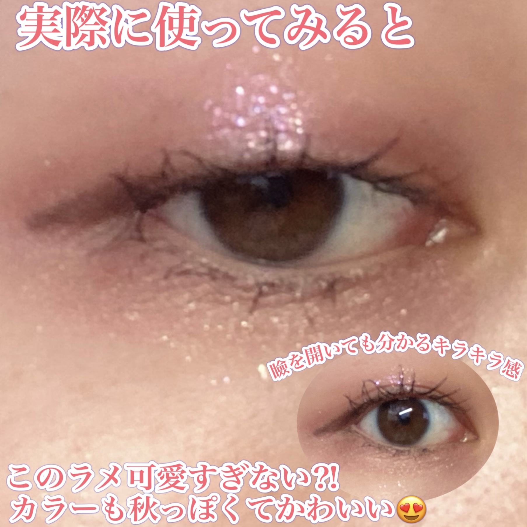 個人的にラメが春の桜のイメージのような華やかかつ大人のような、本当に絶妙なラメで、思わず可愛すぎる🤦♀️とつぶやいてしまいました! 意外と発色はふんわり目で、スウォッチ写真を撮る時は何回か塗りました。 瞼に載せてみてもやはり薄づき。しかしそのおかげかどこか儚げのある瞼になりやすかったです🥰🥰 右上のカラーが絶対涙袋盛りコスメだ!と思い、違う塗り方も試してみました!