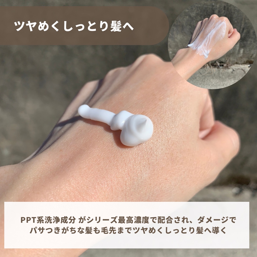 - とろけるような質感と、ダメージでパサつきがちな髪も毛先までツヤめくしっとり髪へ導く美容液シャンプー&光沢補修トリートメント。 より浸透性が高くなるカプセル化技術を採用したシルクリポカプセルを補修成分として配合。 髪の芯まで徹底補修しながらキューティクルをなめらかに整え、しっとりと潤いツヤめく髪へと導きます。 また洗いながらも髪ダメージを補修するPPT系洗浄成分を、シリーズ比で高濃度に配合。 シルク由来PPT系洗浄成分と、肌のことを考えたアミノ酸系の4種の洗浄成分とバランスよくブレンドすることでキメ細かな濃密補修泡が摩擦レスでリッチな洗い心地を実現し、髪と頭皮をいたわりながらシャンプーでも毛髪ダメージに徹底アプローチします。 カシミヤ由来のケラチンをはじめとする2種のケラチン、コラーゲン、CMC類似成分などのこだわり配合した補修成分だけでなく、美容保湿成分をたっぷり浸透させて密封補修することで、カラーや熱ダメージによるパサつき・広がり・ゴワつきなどの蓄積ダメージもしっかりケア。 ドライヤーやヘアアイロンの熱ダメージから髪を守りツヤを与える、ヒートリペア成分を配合して熱も味方に。 清楚な上品さを纏うホワイトフローラル&ペア―の香り。 2024年10月中旬 一部企業にて先行発売