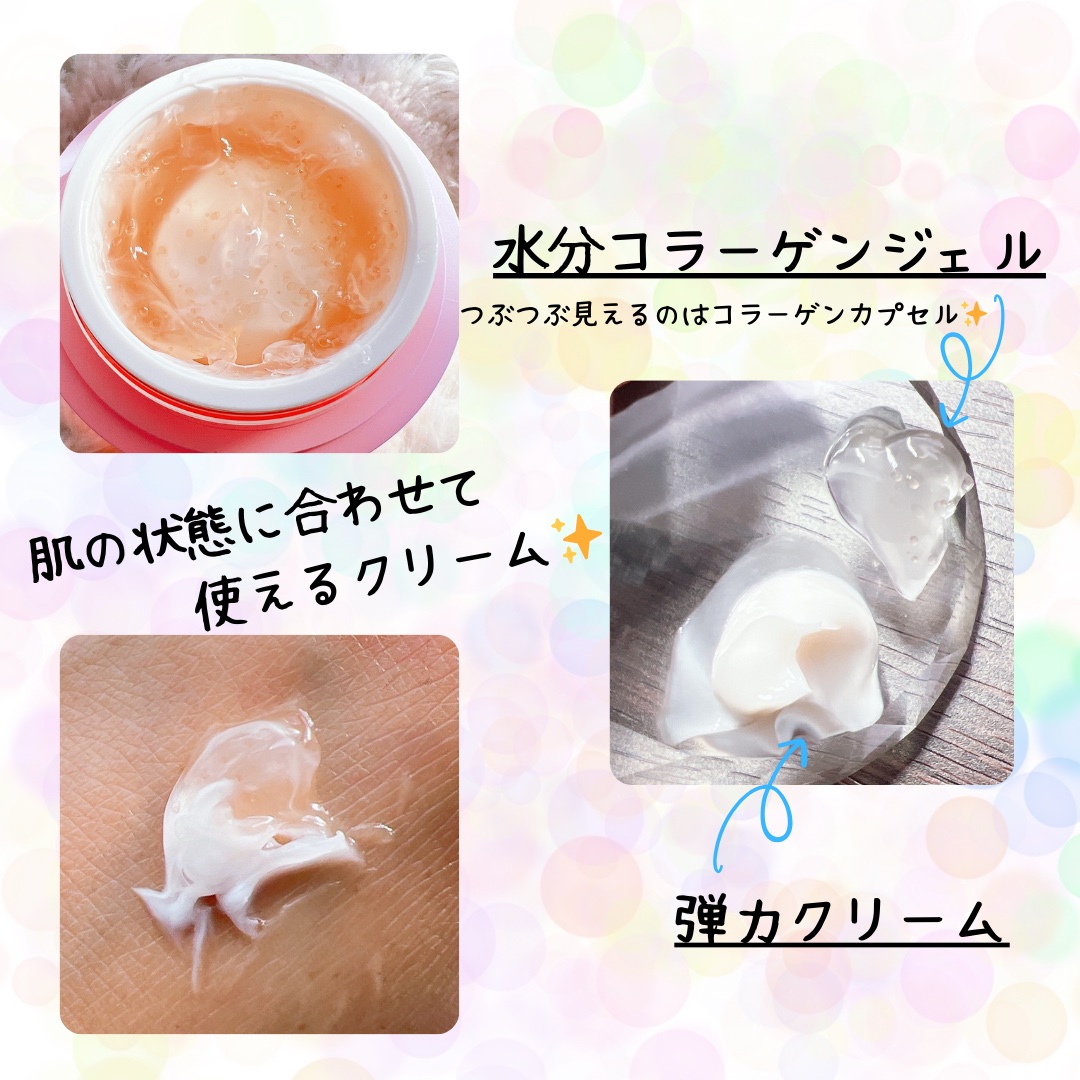 剥がすタイプのパックだけど、毛穴の汚れがが抜けるほど刺激がないので、敏感肌の私でも使用できました! コラーゲンをしっかり感じることができました! コラーゲンの化粧品特有のベタつきがなく、高保湿だったので、乾燥肌の方にもおすすめしたいです! 2層になっているタイプのクリームです! 内側のクリームは重めでしっかり保湿したい方におすすめで、外側のクリームは朝のスキンケアなど、べたつきたくない時におすすめです!
