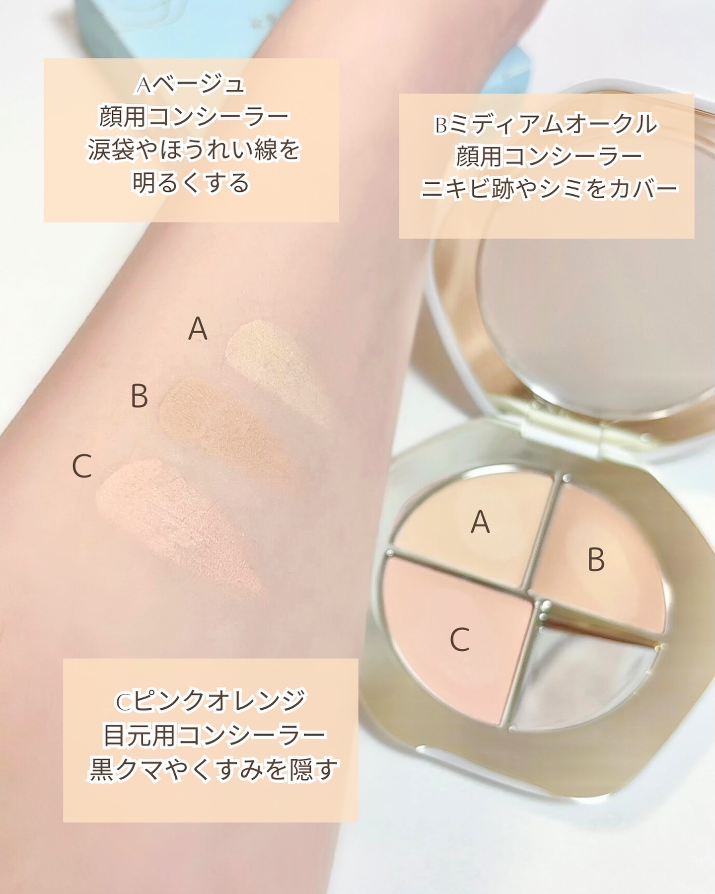 - 様々な肌悩みにアプローチして開発された三色一体型コンシーラーパレット。 3つのカラー、2つのテクスチャーがお悩み別にアプローチ、シームレスな美しい肌に仕上げる。パレットのカラーはクールトーンとウォームトーンを兼ね備えているため、メイク初心者の方でも色選びに悩まずにメイク可能。 さらに、右下部分に斜めのパレットが設計、パレットで3つのカラーを調合して使うことで自分好みの色を調合することができ、様々なお悩みを解決。