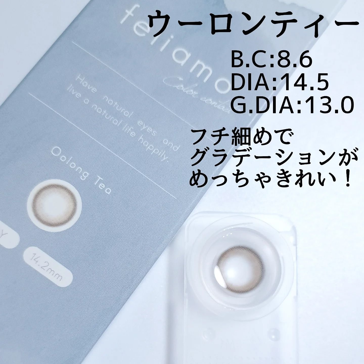 - ※2025年6月以降、商品パッケージ裏面・側面の一部表記を順次変更いたします。尚、これにかかる商品の交換・返品は承っておりません。 どんな瞬間にも溶け込む誰からも愛される瞳へ feliamoの由来は felice amore~幸せな愛~ 瞳から愛されオーラを放つ好印象レンズで女性らしさと品を演出。 オンも、オフも、特別な日も。 どんな場面にも溶け込むレンズラインナップで誰からも愛される瞳に。 UV CUT Feature1 肌や瞳に有害といわれ、白内障などの眼病を引き起こす危険性のある紫外線を99%カットします。(UV-A波75%、UV-B波99%カット) イオン性 Feature1 水分を多く含み酸素を通しやすいため瞳にやさしい使い心地で、快適な装用感です。 高含水 Feature1 水分が多く含むやわらかい素材で、快適なつけ心地です。 レンズ構造 Feature1 まぶた側に着色剤を内包しているため、角膜に色素が触れることがない構造を採用しています。 レンズ形状 Feature1 フチを丸みのある形状にすることで自然な装用感を実現しました。 ※装用感には個人差があります。 カラーコンタクトレンズの不適正使用による眼障害の危険性等などがあります。 ●コンタクトレンズは高度管理医療機器です。不十分な洗浄・消毒など不適切なケアや、長時間・交換期間を超えた装用により、アレルギー性結膜炎、角膜感染症、角膜潰瘍等の重篤な眼障害が発生する危険性があります ●ご使用前に取扱説明書を確認してください 使用上の留意事項 ●眼科医院等を受診してからお求めください ●眼に異常を感じたら直ちにレンズ使用を中止し、お近くの眼科等で診察を受けてください ●医師の指示にしたがってご使用ください ●コンタクトレンズを装用する場合、自覚症状がなくても、眼科医院等での定期検査を受けてください ●レンズに不具合がある場合は使用しないでください