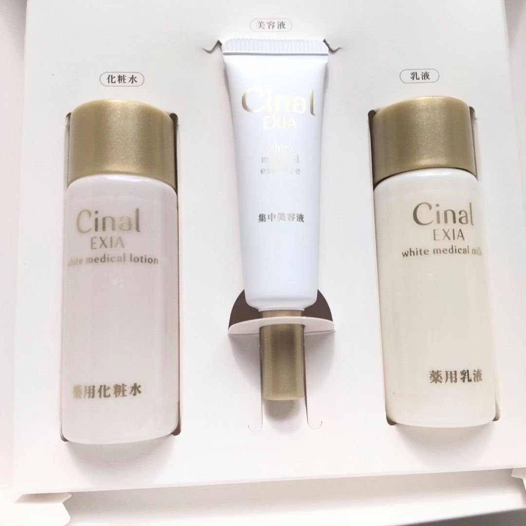 - シナールエクシア スキンケアシリーズのベーススキンケアである化粧水・乳液・美白美容液をセットにしたトライアルキットです。約10日間、シナールエクシア スキンケアシリーズの全ラインをお試しいただけるお得なセットになっています。 内容・容量: シナールエクシア ホワイトメディカルローション (販売名:CNL薬用化粧水W〔医薬部外品〕18mL) シナールエクシア ホワイトメディカルミルク(販売名:CNL薬用乳液W〔医薬部外品〕18mL) シナールエクシア ホワイトメディカルエッセンス(販売名: CNL薬用美容液W〔医薬部外品〕5g)