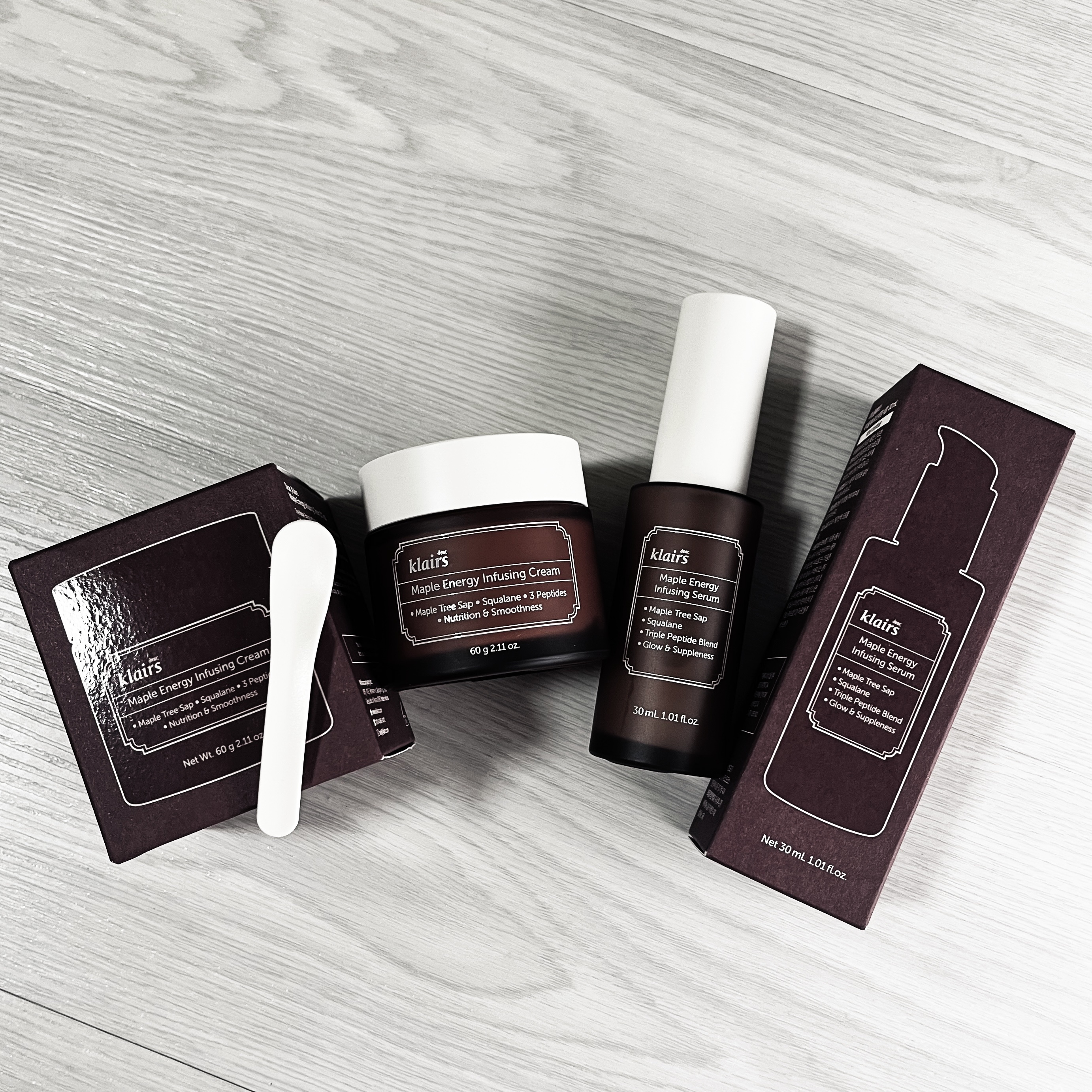 1年にたった1度しか採取できない、栄養素が豊富で保湿力に長けたメープルの樹液を使用したメープルエナジーライン🍁 精製水の代わりにメープルの樹液を55.9%含有しているセラム 水分バリアの改善が期待でき、シロップスキンが毛穴、弾力ケアや小じわケアをサポートしてくれるそう✨ なめらかなテクスチャーでしっとりするけど重くない使い心地です😉 ベタつき感があまりないので朝も使いやすく感じました✨