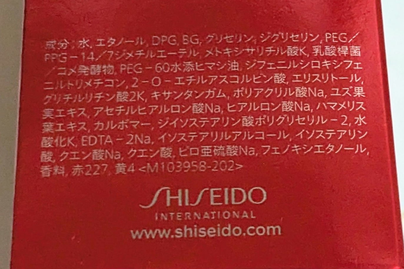 - <本体145ml> 水、エタノール、DPG、BG、グリセリン、ジグリセリン、PEG/PPG-14/7ジメチルエーテル、メトキシサリチル酸K、乳酸桿菌/コメ発酵物、PEG-60水添ヒマシ油、ジフェニルシロキシフェニルトリメチコン、2-O-エチルアスコルビン酸、エリスリトール、グリチルリチン酸2K、キサンタンガム、ポリアクリル酸Na、ユズ果実エキス、アセチルヒアルロン酸Na、ヒアルロン酸Na、ハマメリス葉エキス、カルボマー、ジイソステアリン酸ポリグリセリル-2、水酸化K、EDTA-2Na、イソステアリルアルコール、イソステアリン酸、クエン酸Na、クエン酸、ピロ亜硫酸Na、フェノキシエタノール、香料、赤227、黄4 <レフィル145ml> 水、エタノール、DPG、BG、グリセリン、ジグリセリン、PEG/PPG-14/7ジメチルエーテル、メトキシサリチル酸K、乳酸桿菌/コメ発酵物、PEG-60水添ヒマシ油、ジフェニルシロキシフェニルトリメチコン、2-O-エチルアスコルビン酸、エリスリトール、グリチルリチン酸2K、キサンタンガム、ポリアクリル酸Na、ユズ果実エキス、アセチルヒアルロン酸Na、ヒアルロン酸Na、ハマメリス葉エキス、カルボマー、ジイソステアリン酸ポリグリセリル-2、水酸化K、EDTA-2Na、イソステアリルアルコール、イソステアリン酸、クエン酸Na、クエン酸、ピロ亜硫酸Na、フェノキシエタノール、香料、赤227、黄4