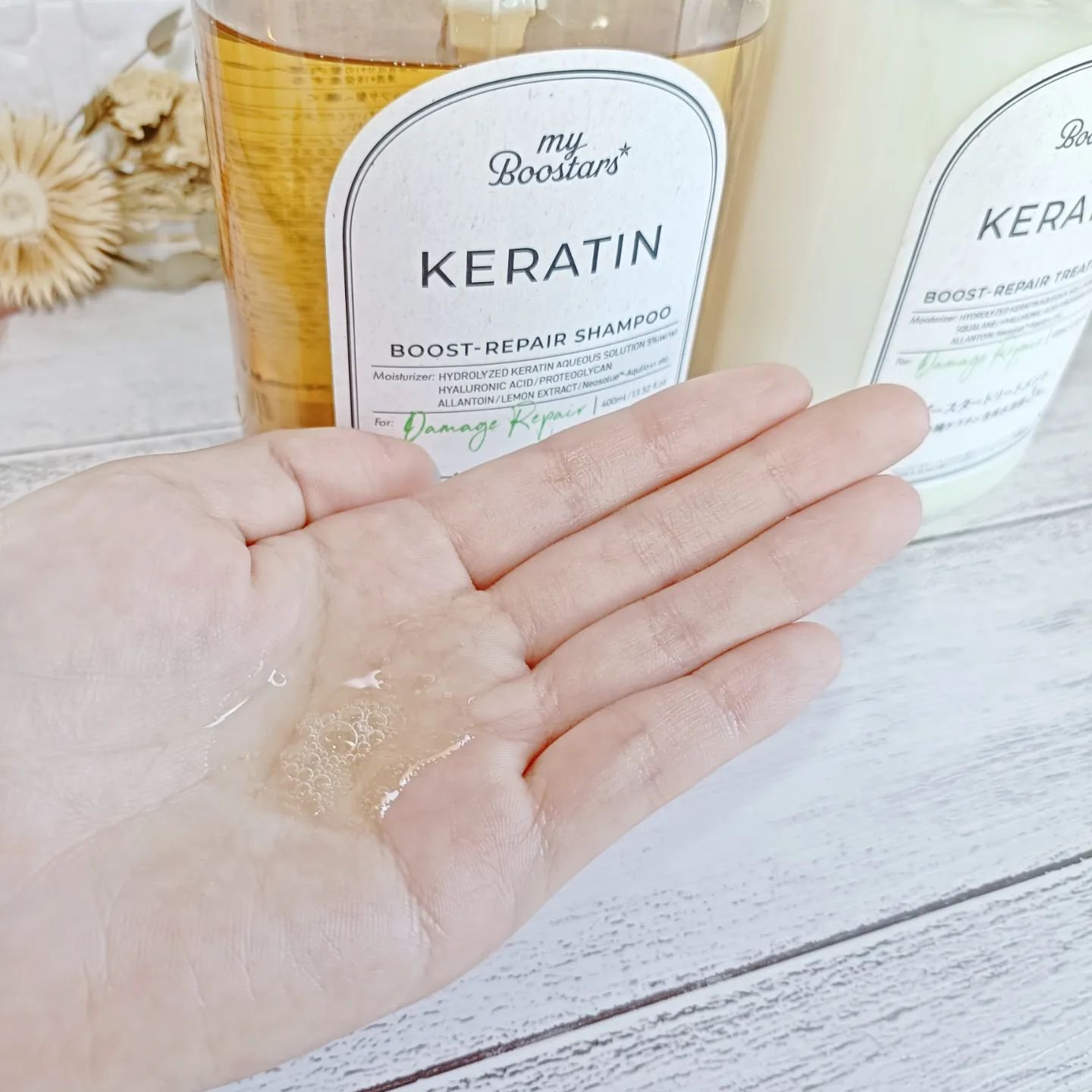 - 加水分解ケラチン(*1)配合、スキンケア発想から生まれたブースターシャンプー。ダメージを補修し、しなやかなツヤ髪へ導きます。シトラスサボンの香り。 ●加水分解ケラチン含有水溶液 5%(*2) ●ケラチンブーストリペア処方 マイクロケラチン(*1):カラーやパーマでダメージを受けた髪を補修する ブースター(*3):美容液成分(*1)の髪内部への浸透(*4)をサポートする ●サルフェート・シリコーン・パラベン・鉱物油・合成着色料フリー 加水分解ケラチン(*1)配合、スキンケア発想から生まれたブースタートリートメント。ダメージを補修し、しなやかなツヤ髪へ導きます。シトラスサボンの香り。 ●加水分解ケラチン含有水溶液 3%(*2) ●ケラチンブーストリペア処方 マイクロケラチン(*1):カラーやパーマでダメージを受けた髪を補修する ブースター(*3):美容液成分(1)の髪内部への浸透(*4)をサポートする ●サルフェート・パラベン・鉱物油・合成着色料フリー *1 加水分解ケラチン(羊毛) (毛髪補修成分) *2 化粧品原料(水、BG、加水分解ケラチン(羊毛)、フェノキシエタノール)として (毛髪補修成分) *3 シクロヘキサン-1,4-ジカルボン酸ビスエトキシジグリコール (保湿成分) *4 髪の内部まで