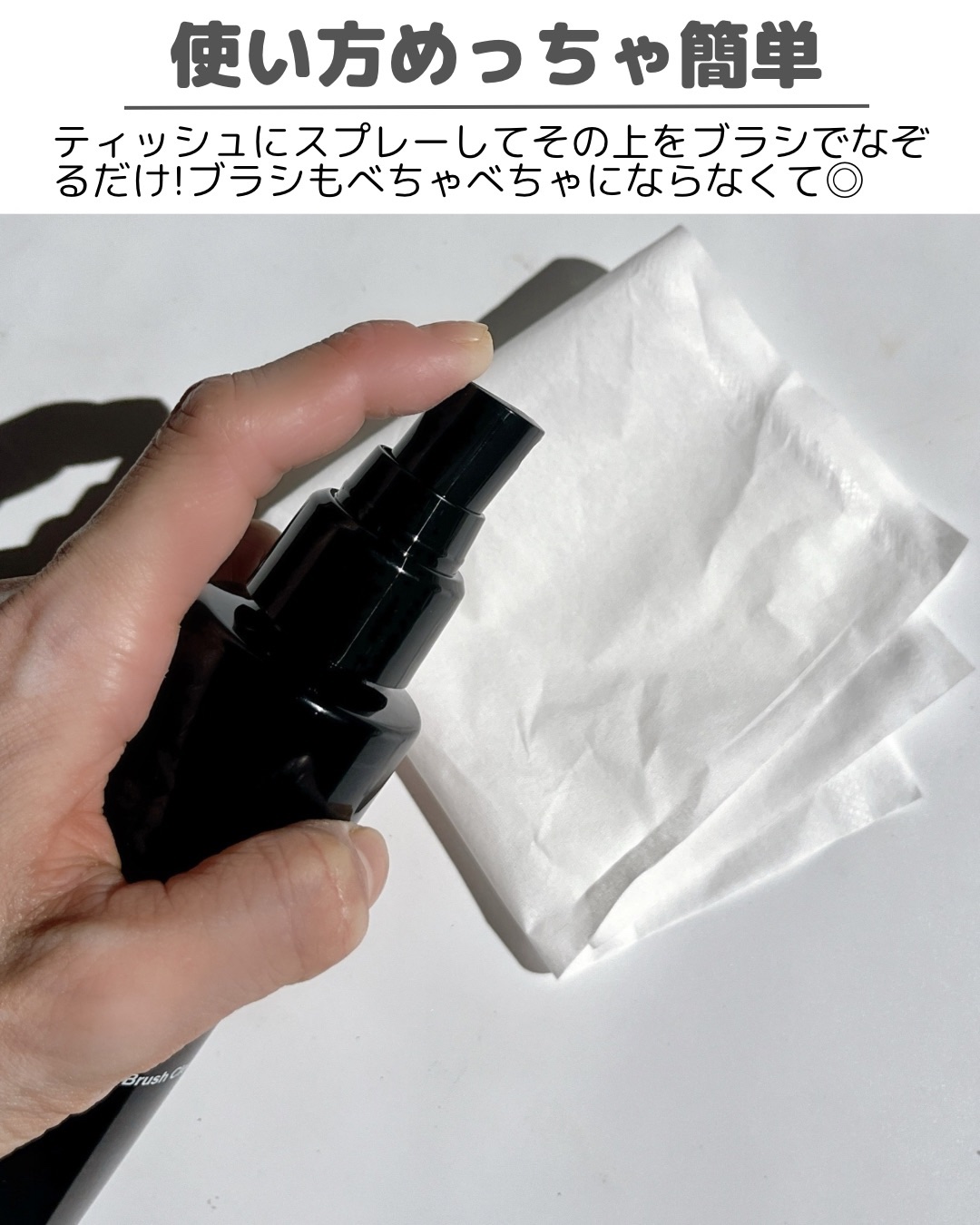 - <化粧用具>ブラシについたメイクアップの汚れを素早く簡単に落とす、SHISEIDOのメイクアップブラシ専用クリーナー。 ブラシについたメイクアップの汚れを素早く簡単に落とします。速乾性に優れベタつきが無く、ブラシのコンディションを整え、いつでもフレッシュな状態に保ちます。ミストタイプで手軽に使うことができ、使用するたびブラシのメンテナンスをすることで、長期間ブラシの品質を保つことができます。 ○ ブラシの洗浄性に特化させたシンプル処方 ○ 無香料・無着色・パラベンフリー・シリコンフリー・サルフェートフリー・動物由来成分フリー ■使用法 ● ティッシュペーパーを適度なサイズに折り、5~6cm程はなしてブラシクリーナーを3~4プッシュ吹きかけ、ティッシュペーパーの表面をブラシで数回なでるようにしながら、汚れをふき取ります。 ● 汚れがつかなくなるまで繰り返してください。