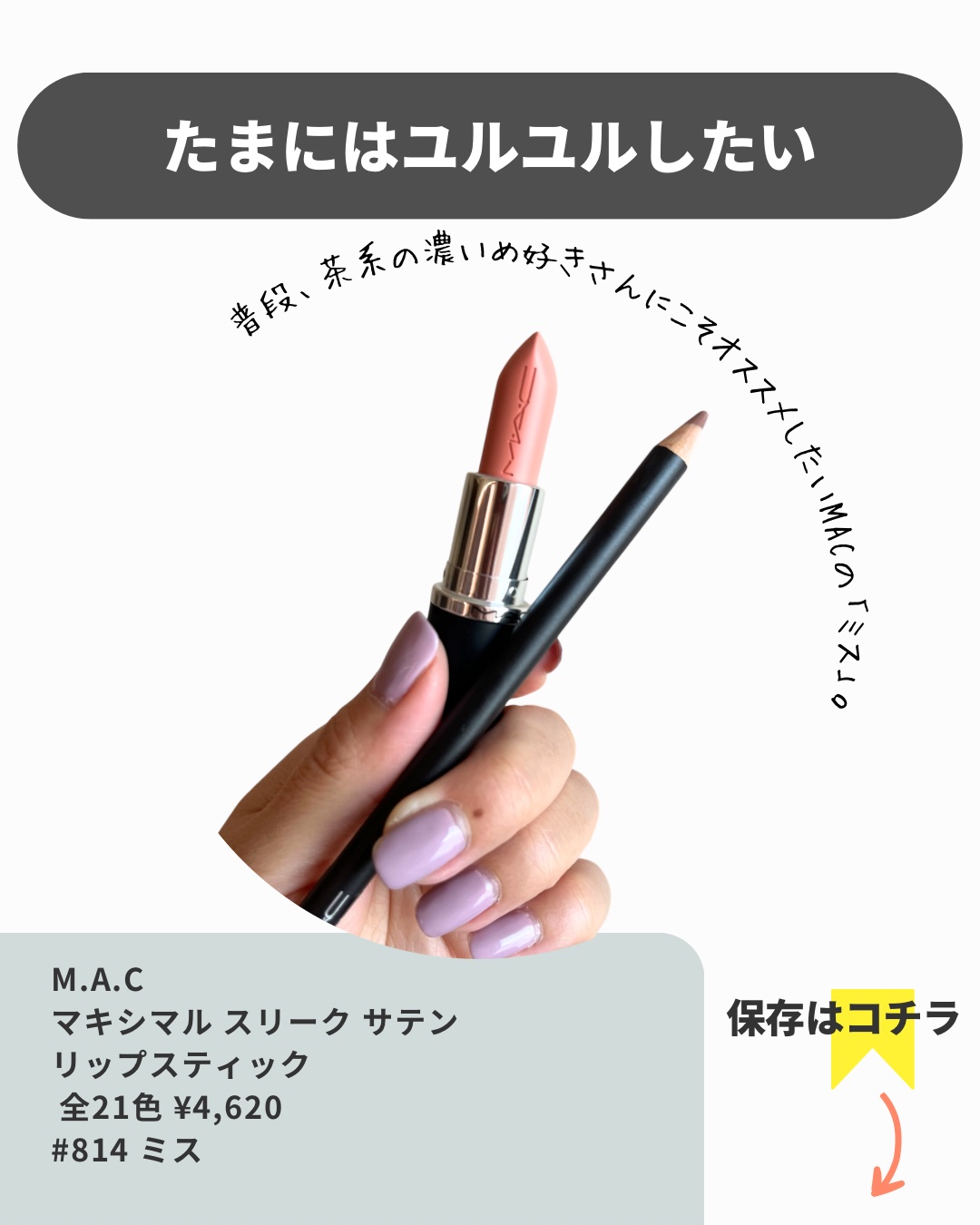 M.A.C史上最高濃度の美容保湿成分(ザクロエキス・ローズヒップオイル・ユチャ種子油)配合の美容液サテンリップ めっちゃキレイに発色するし、美容液サテンリップと銘打ってるだけあってつけ心地もサイコーですよ。 茶系が好きで着けてまーす!って方にはメチャクチャおすすめしたい#807トゥルースビーアントールド。