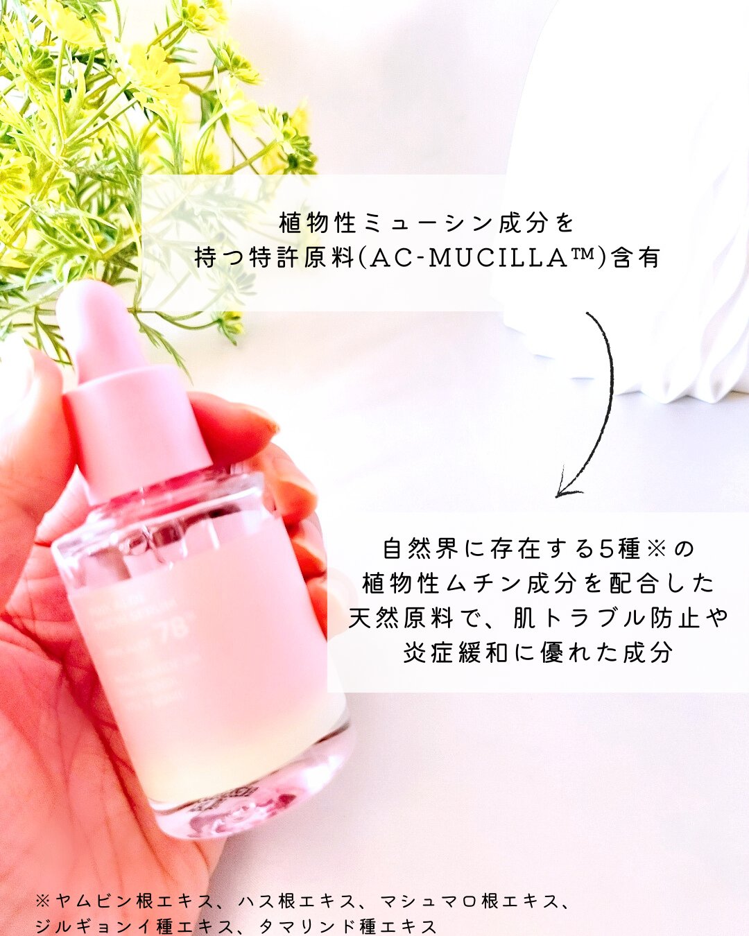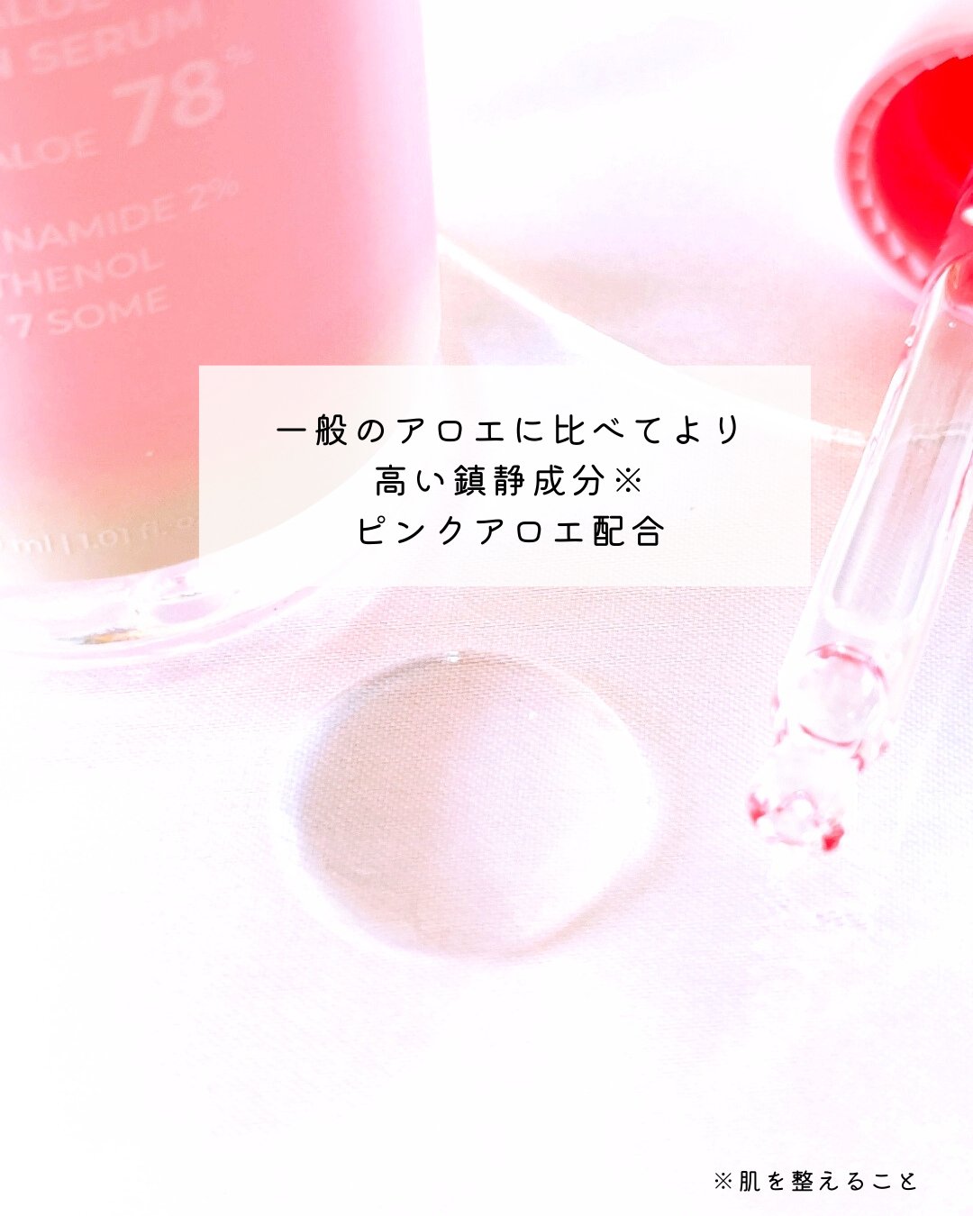 ピンクアロエ(ピンクアロエアロエベラの葉)が78%も配合され、肌トラブルの痕跡をケアしてくれる、鎮静&美白ケア特化美容液❤︎ トロッとした透明のセラムが肌にスッと溶けこむように馴染んで、さっぱり&もちもちになります。 一週間でトラブル痕跡を改善させた実績が公式情報にあり、赤みやニキビ跡などで悩んでいる方はぜひ使ってみてほしいです。