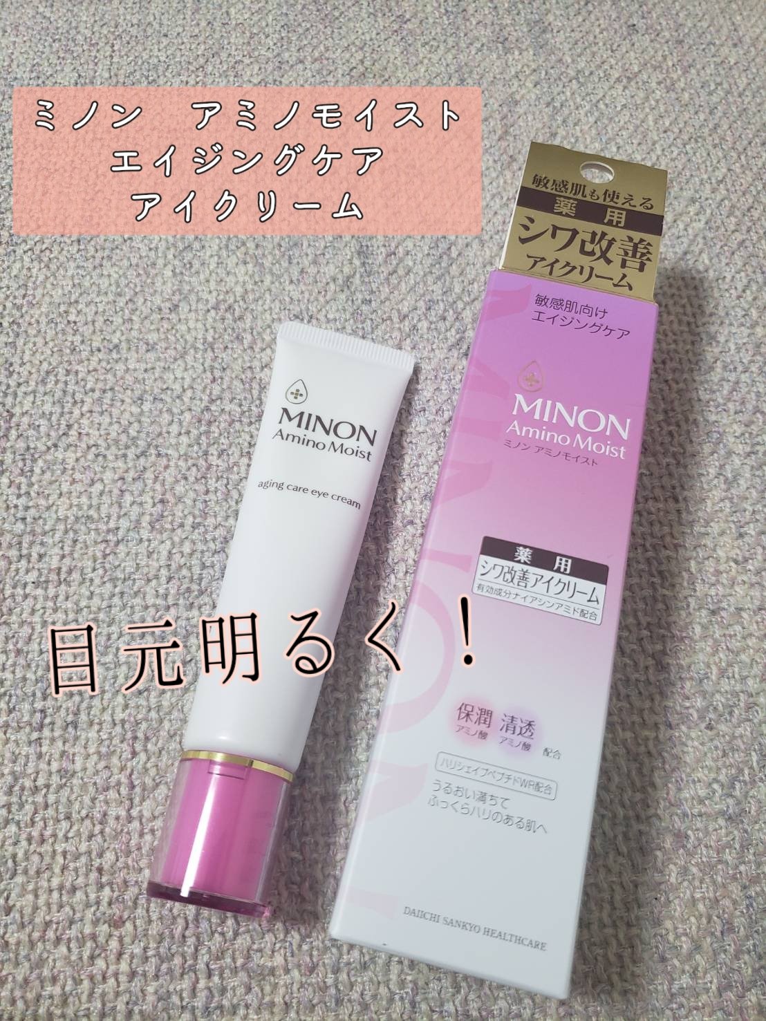 - 【敏感肌も使える薬用シワ改善アイクリーム】 ダブルの有効成分配合。気になるシワを改善し、しみ・そばかす*1、肌あれを防ぎます。 ●ナイアシンアミド:シワ改善&しみ予防 ●グリチルリチン酸2K:肌あれ予防 ハリを与えつや肌に導く「ハリシェイプペプチドWR*2」配合。 使い続けるたび、シワを改善し、うるおってハリのある明るい印象の目元へ。 エイジングケア:年齢に応じたお手入れケア *1メラニンの生成を抑え、しみ・そばかすを防ぐ *2ヤシ油脂肪酸水解コラーゲンK (販売名:ミノンアミノモイストAE)【医薬部外品】