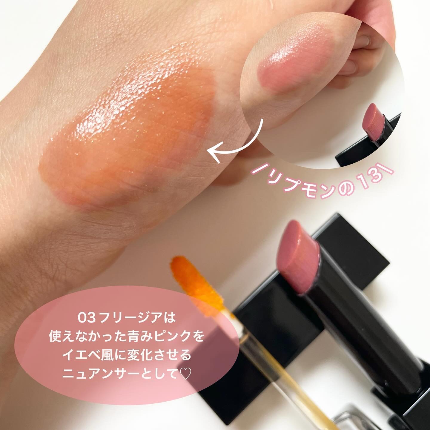 5種の美容保湿成分配合とのことでかなりするする〜っと塗り心地◎✨ うっすら透け感を感じるツヤ感たっぷりな仕上がり☺️♡ 02オランジュベージュの色味は”ベージュベースにオレンジ果汁を絞ったような”カラーだそうです🍊 ティントでは無いのに色持ちかなりかなりよしです!! これ本当に忖度なしにめちゃくちゃ良かったです😭💕