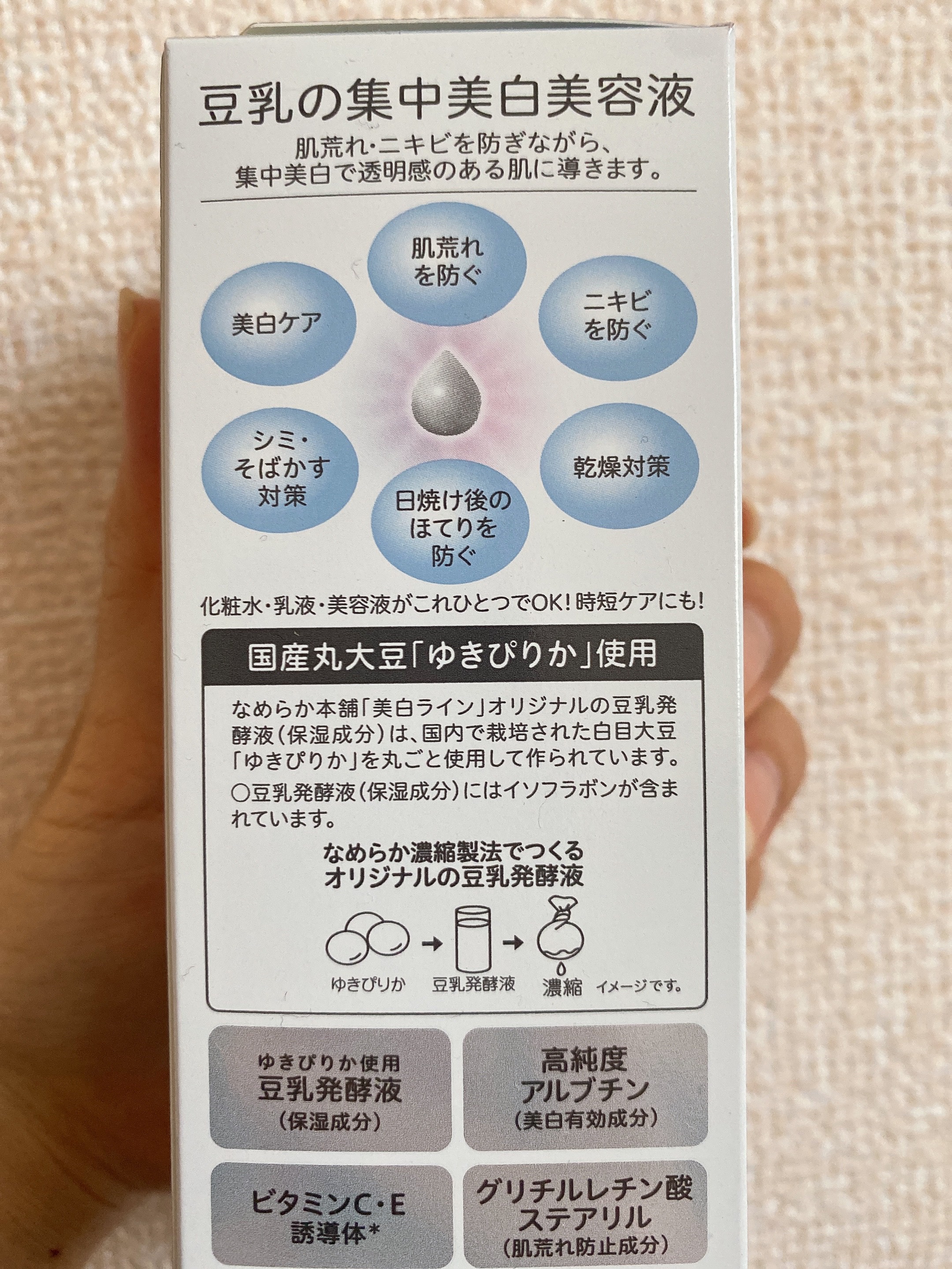 - <100ml> 水、BG、ジグリセリン、フェノキシエタノール、エタノール、ステアリン酸、セタノール、水酸化Na、濃グリセリン、グリチルレチン酸ステアリル、アルブチン、シュガースクワラン、カルボキシビニルポリマー、メチルポリシロキサン、豆乳発酵液、トリメチルグリシン、リン酸L-アスコルビルマグネシウム、アクリル酸・メタクリル酸アルキル共重合体、パラベン、水素添加大豆リン脂質、フィトステロール、ダイズエキス、親油型モノステアリン酸グリセリル、部分水素添加ホホバ油、モノステアリン酸ポリエチレングリコール、ジエチレントリアミン五酢酸五ナトリウム液、ポリオキシブチレンポリオキシエチレンポリオキシプロピレングリセリルエーテル(3B.O.)(8E.O.)(5P.O.)、dl-α-トコフェロール 2-L-アスコルビン酸リン酸ジエステルカリウム塩、モノパルミチン酸ポリオキシエチレンソルビタン(20E.O.)