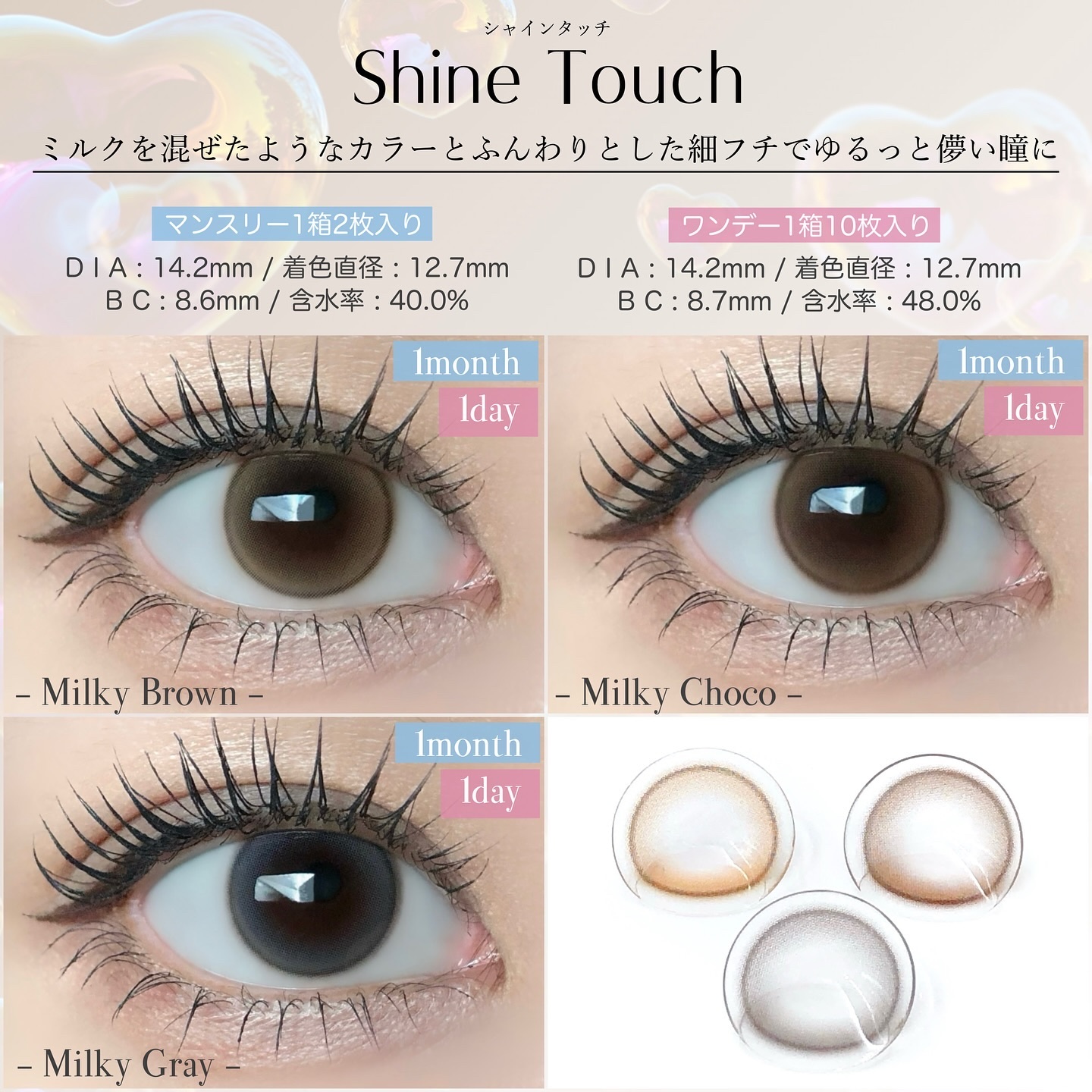 Flurry by colors#フルーリーB C : 8.6mm / 含水率 : 58.0%(D I A ・着色直径は各カラーに記載)ワンデー1箱10枚入 / 全10色 🐩 #くりくりプードル 🆕( DIA :15.0mm / 着色直径 : 14.4mm )【明日花キララちゃん2ndプロデュースレンズ】フルーリーでも特に人気のリングフチのブラウンver.!太め・濃いめのぼかしフチ✖️やや赤み寄りブラウン。うるうるな赤茶目の愛されプードルeyeに💓 🦭 #あざとあざらし 🆕( DIA :14.5mm / 着色直径 : 14.0mm )裸眼の色に馴染む透明感のあるシアーベージュ。ダークブラウンともチョコとも違うあざとくて上品な瞳に🤍