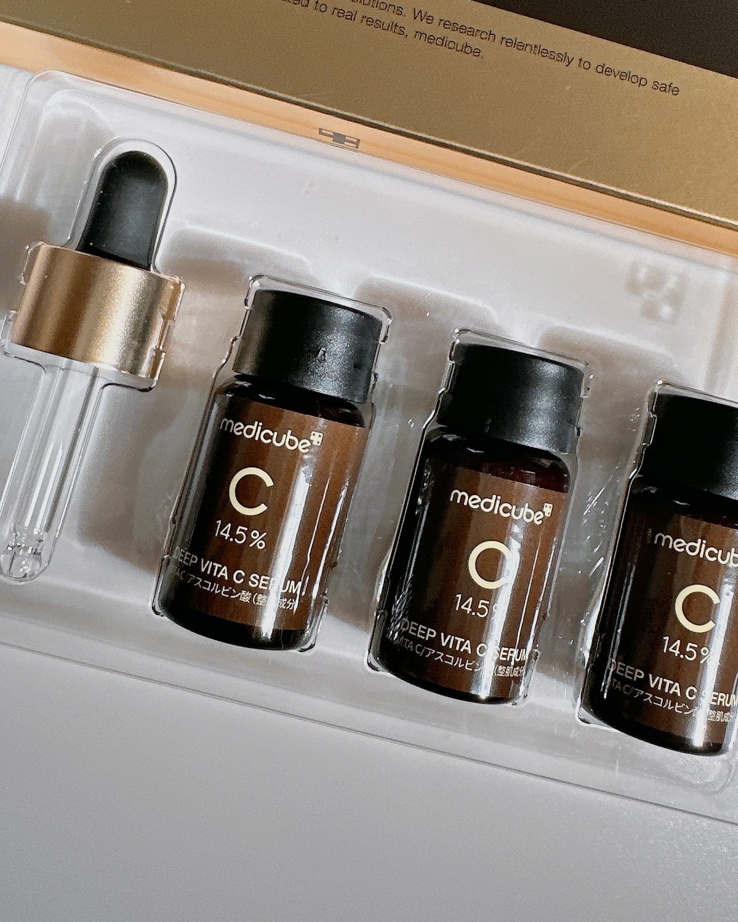 韓国🇰🇷ダーマコスメブランドの[medicube(メディキューブ)]のシミ消しケア。累計100万個販売突破の人気のアイテム! 7日間で肌がトーンアップすることが臨床試験で確認され、美白としわ改善もケアできる美容液✨ とにかく濃い! トロッと濃厚なのがわかります 高濃度ビタミンの証、独特の香りがします