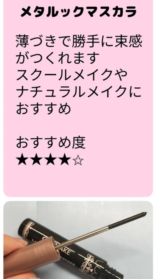 上まつ毛も下まつ毛も簡単に束感出来る。 マスカラ苦手だから塗るだけできれいなまつ毛が出来上がるのがすごく良かった。 まつ毛が派手な感じになるのがいい。 ウォータープルーフだけどお湯でオフできる。値段が凄くやすい!660円 簡単に束感まつ毛にしたいときはメタルックマスカラがいい! ゴクブトマスカラも使いにくいわけでは無いし2回くらい塗るとちょうどいいボリューム感がでて、メタルックマスカラよりも派手な目元になる。