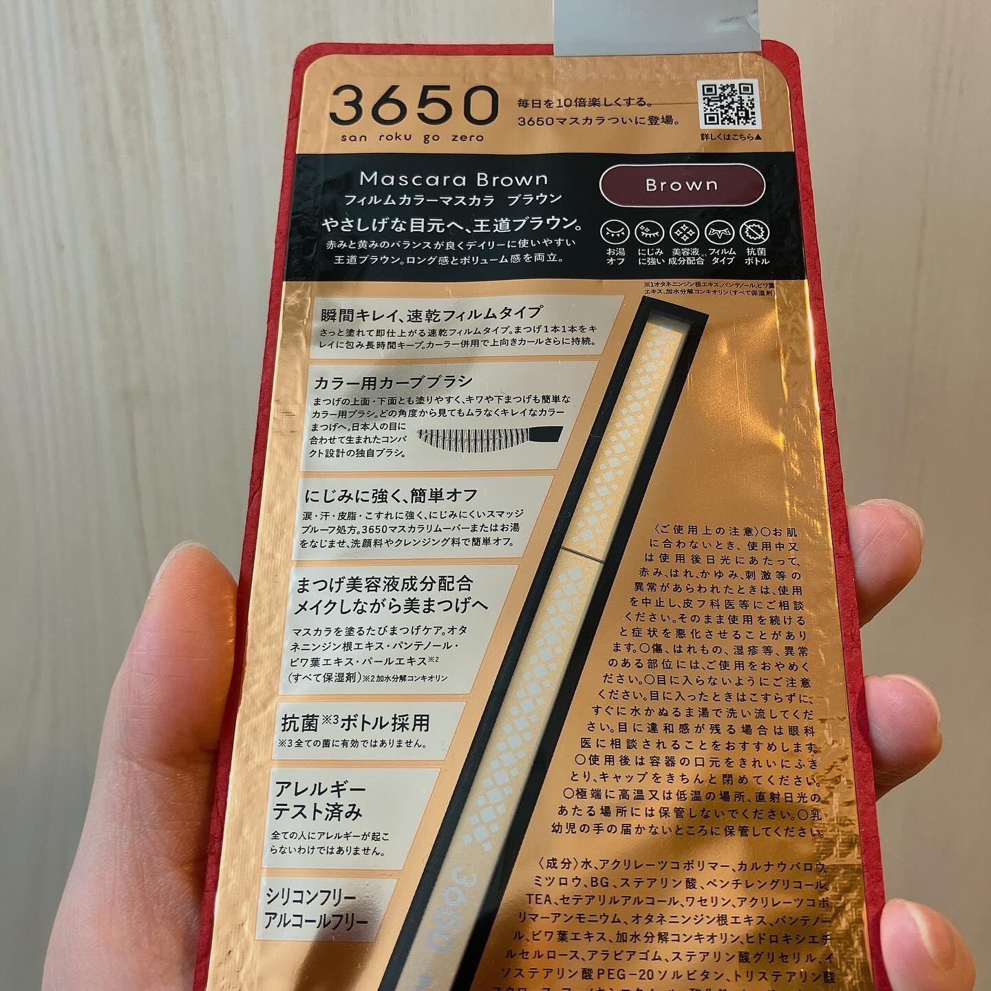 - 【瞬間キレイ、速乾フィルムタイプ】 さっと塗れて即仕上がる速乾フィルムタイプ。まつげ1本1本をキレイに包み長時間キープ。上向きカール持続。 【カラー用カーブブラシ】 まつげの上面・下面とも塗りやすく、キワや下まつげも簡単なカラー用ブラシ。どの角度から見てもムラになりにくくキレイなカラーまつげへ。 日本人の目に合わせて生まれたコンパクト設計の独自ブラシ。 【にじみに強く、簡単オフ】 涙・汗・皮脂・こすれに強く、にじみにくいスマッジプルーフ処方。3650マスカラリムーバまたはお湯をなじませ、洗顔料やクレンジング料でオフ。 【まつげ美容液成分配合メイクしながら美まつげへ】 マスカラを塗るたびまつげケア。オタネニンジン根エキス・パンテノール・ビワ葉エキス・パールエキス*1(全て保湿剤) 【抗菌*2ボトル採用】 【アレルギーテスト済み】 全ての人にアレルギーが起こらないわけではありません。 【シリコンフリー アルコールフリー】 *1 加水分解コンキオリン *2 全ての菌に有効ではありません。 <コッパー> 目元に抜け感、華やかコッパー 明るく魅せるパール入り。抜け感ある、デイリーに使いやすいカラー。ロング感とボリューム感を両立。 <バーガンディ> 透明感引き立つ、バーガンディー。 瞳の透明感と目元の血色感を与える、デイリーに使いやすいカラー。ロング感とボリューム感を両立。 <ブラウン> やさしげな目元へ、王道ブラウン。 赤みと黄みのバランスが良くデイリーに使いやすい王道ブラウン。ロング感とボリューム感を両立。