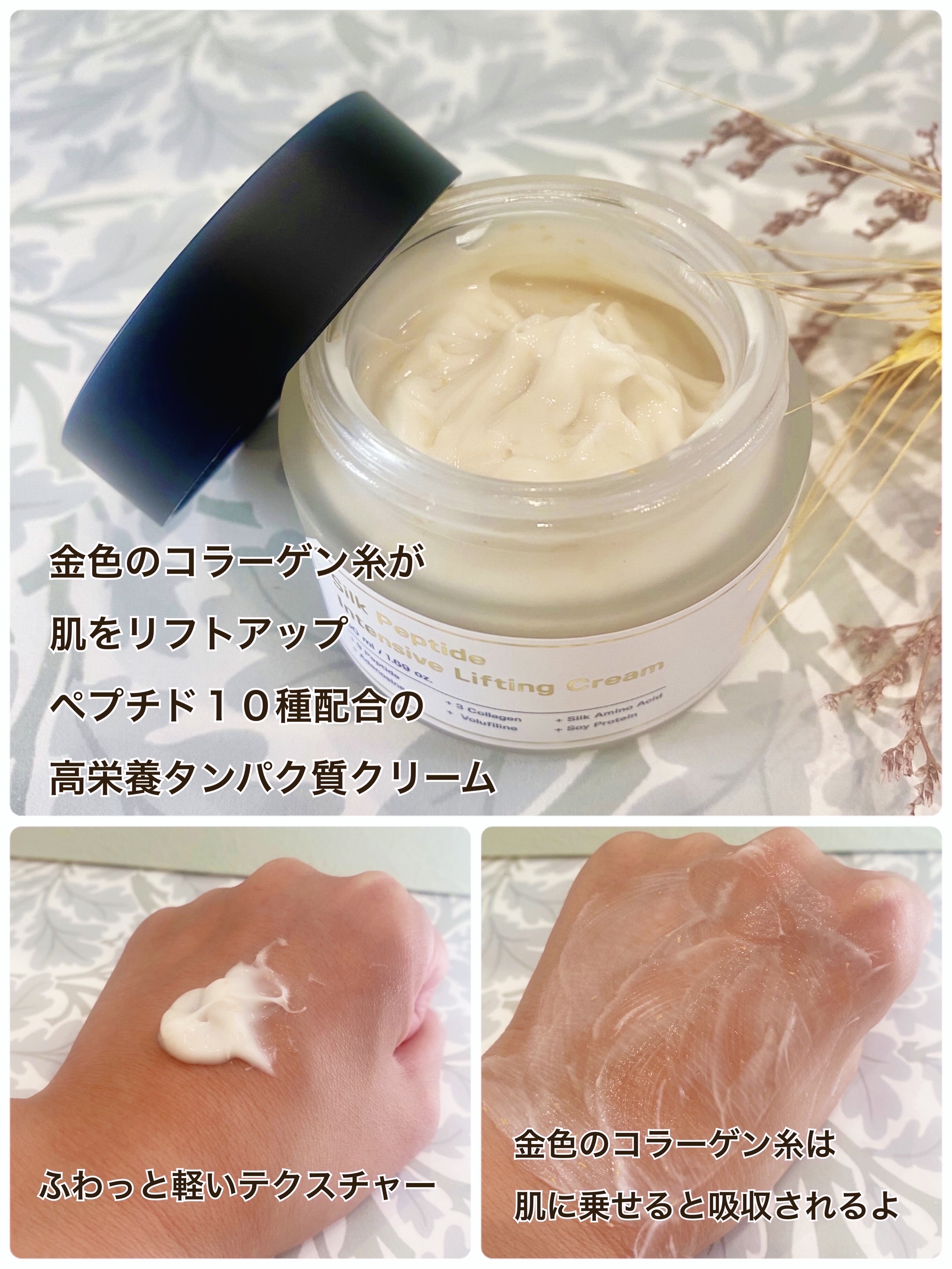 人気のペプチドアンプルからクリームが新登場SUNGBOONEDITORシルクペプチドインテンシブリフティングクリーム「塗る糸リフト」と呼ばれるゴールドの糸が入っていてこっくりしたテクスチャーのクリーム✨粘度があるねっちりながら伸びが良くて...