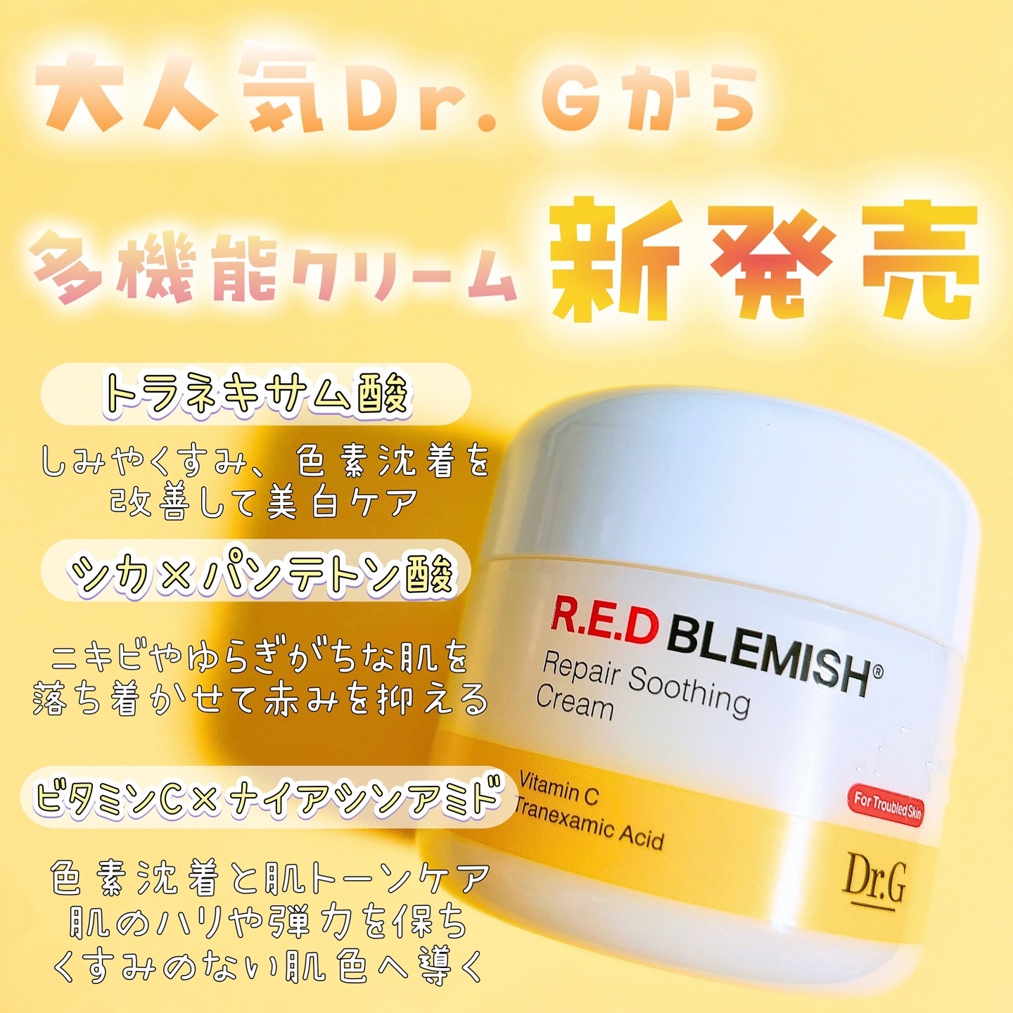 韓国コスメの大人気ブランド【 Dr.G ドクタージー】 今回はレッドブレミッシュシリーズの「レッドブレミッシュリペアスージングクリーム」を使ってみました♪ シカ&パントテン酸でニキビやトラブルを鎮静させてトラネキサム酸がその後をケア。 見ためよりもなめらかでしっとりとしたテクスチャー。肌なじみもよく保湿力もあって乾燥しやすい今の季節にも使いやすいです。