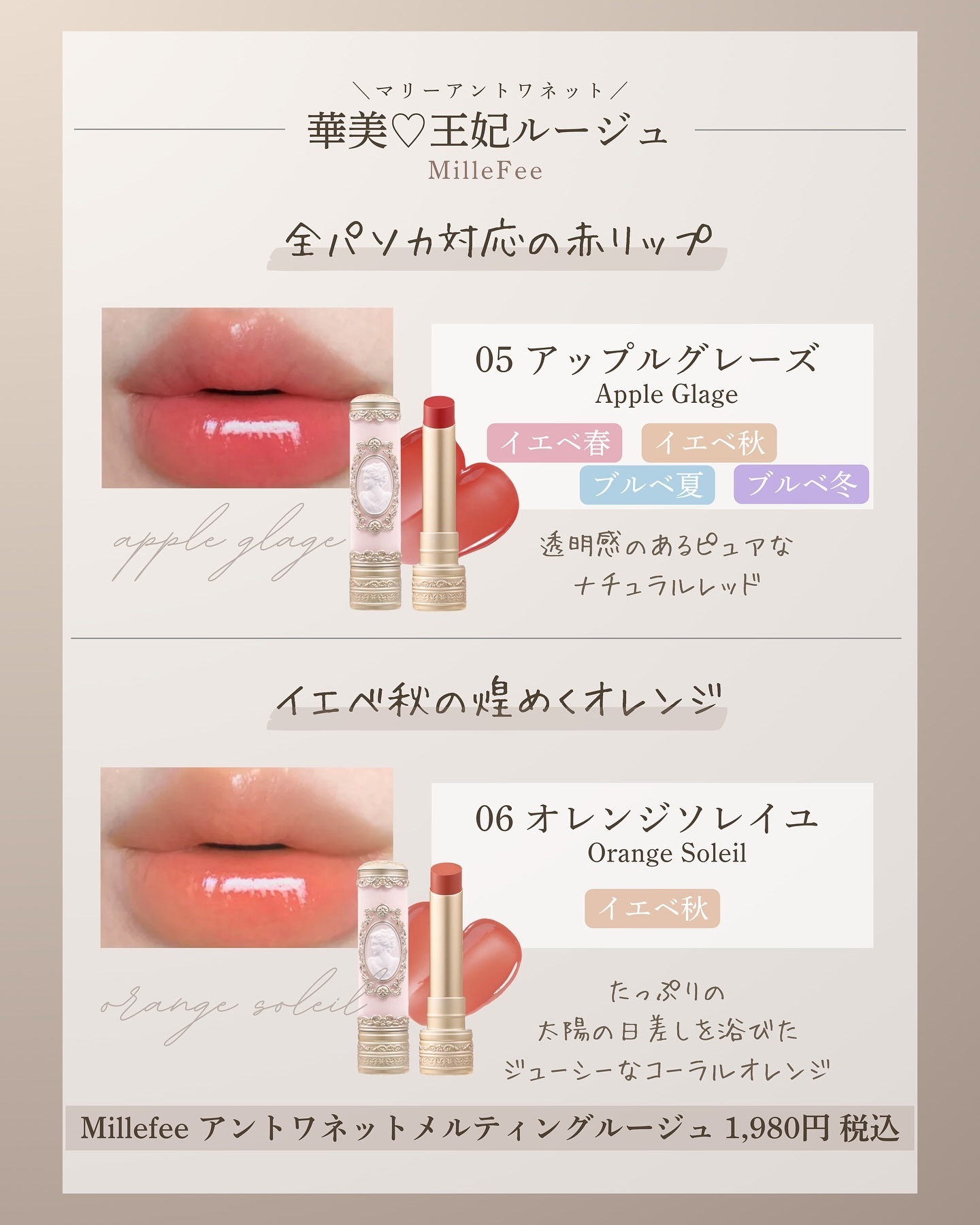 リッチなツヤが煌めく♡王妃ルージュ 𝐌𝐢𝐥𝐥𝐞𝐟𝐞𝐞待望の新シリーズ⟡.· 王妃マリーアントワネットからインスパイアされたスウィートでエレガントなロココ時代コスメが誕生❤︎ 𝟏𝟎/𝟏𝟖に発売されたばかりのロイヤルリップがたまらない! 超イエベ春のわたしはマロンロゼ狙ってるよ💄