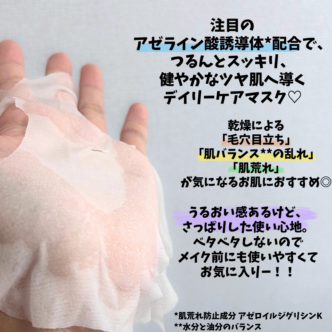 - 肌荒れ・皮脂ケア※1と健やかな肌の土台※2美容を叶える、アゼライン酸誘導体*1配合のうるおいツヤ肌管理マスクです。 肌荒れや肌の赤み、毛穴目立ちが気になる方に。 アゼライン酸*1×ナイアシンアミド*2+次世代ヒアルロン酸*3配合で、肌荒れをケアし、角質層をみずみずしいうるおいで満たします。 さらに肌表面でゆっくりと働くマイルドAHA*4が、古い角質をやわらげ、キメを整えることで、つるんとツヤめく素肌へ導きます。 シートはとろけるように肌に密着するメルティーフィールシートを採用。 シートが最も柔らかく感じられる液量を研究し、まるで水の層に包まれているような心地よさを実現しています。 (※1 ふき取りによる ※2 角質層のこと *1 肌荒れ防止成分 アゼロイルジグリシンK *2 整肌成分 *3 肌荒れ防止成分 加水分解ヒアルロン酸Na *4 整肌成分 マンデル酸)