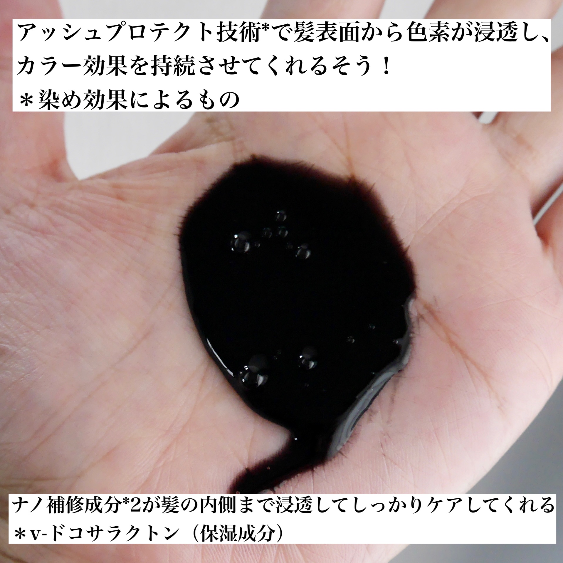 - <シルバー> 水、ラウレス硫酸Na、ラウラミドプロピルベタイン、グリセリン、コカミドDEA、ココイルメチルタウリンNa、加水分解ケラチン(羊毛)、加水分解シルク、加水分解コラーゲン、γ-ドコサラクトン、液状ラノリン、(加水分解シルク/PGプロビルメチルシランジオール)クロスポリマー、アルガニアスピノサ核油、シア脂、ハチミツ、トコフェロール、フィトステロールズ、クエン酸、ジオレイン酸PEG-120メチルグルコース、BG、ポリクオタニウムー10、ポリクオタニウムー7、ベへントリモ二ウムクロリド、ジステアリルジモニウムクロリド、プロパンジオール、塩化Na、インプロパノール、エタノール、EDTA-2Na、安息香酸Na、フェノキシエタノール、香料、(+/-)塩基性青99、塩基性茶16、塩基性赤76、塩基性紫2、HC青2 <ピンク> 水、ラウレス硫酸Na、ラウラミドプロピルベタイン、グリセリン、コカミドDEA、ココイルメチルタウリンNa、加水分解ケラチン(羊毛)、加水分解シルク、加水分解コラーゲン、γ-ドコサラクトン、液状ラノリン、(加水分解シルク/PGプロビルメチルシランジオール)クロスポリマー、アルガニアスピノサ核油、シア脂、ハチミツ、トコフェロール、フィトステロールズ、クエン酸、ジオレイン酸PEG-120メチルグルコース、BG、ポリクオタニウムー10、ポリクオタニウムー7、ベへントリモ二ウムクロリド、ジステアリルジモニウムクロリド、プロパンジオール、塩化Na、インプロパノール、エタノール、EDTA-2Na、安息香酸Na、フェノキシエタノール、香料、(+/-)塩基性青99、塩基性茶16、塩基性赤76、塩基性紫2、HC青2 <ムラサキ> 水、ラウレス硫酸Na、ラウラミドプロピルベタイン、グリセリン、コカミドDEA、ココイルメチルタウリンNa、加水分解ケラチン(羊毛)、加水分解シルク、加水分解コラーゲン、γ-ドコサラクトン、液状ラノリン、(加水分解シルク/PGプロビルメチルシランジオール)クロスポリマー、アルガニアスピノサ核油、シア脂、ハチミツ、トコフェロール、フィトステロールズ、クエン酸、ジオレイン酸PEG-120メチルグルコース、BG、ポリクオタニウムー10、ポリクオタニウムー7、ベへントリモ二ウムクロリド、ジステアリルジモニウムクロリド、プロパンジオール、塩化Na、インプロパノール、エタノール、EDTA-2Na、安息香酸Na、フェノキシエタノール、香料、(+/-)塩基性青99、塩基性茶16、塩基性赤76、塩基性紫2、HC青2