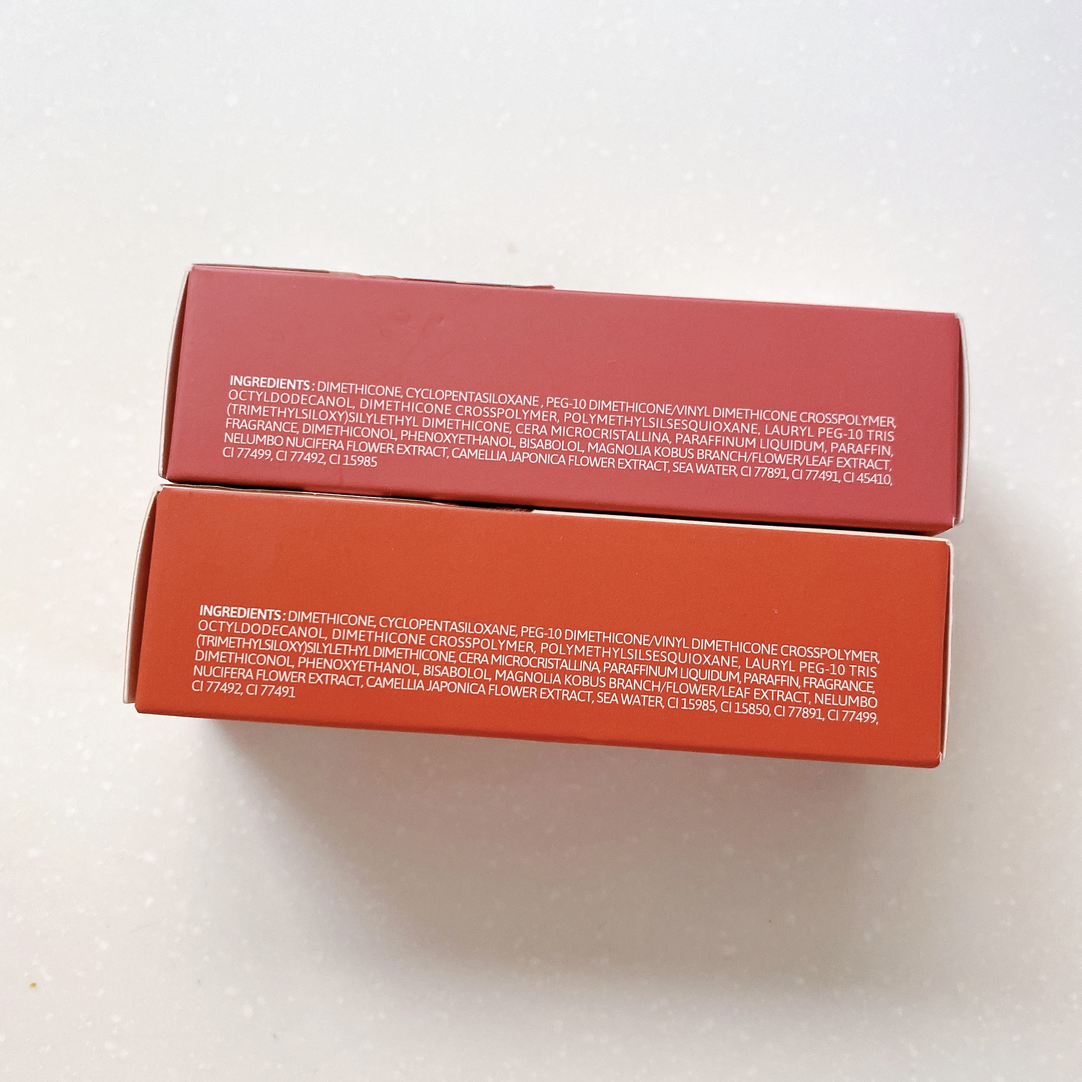 - <04 スコアピンク(Score Pink)> ジメチコン、シクロペンタシロキサン、(PEG-10ジメチコン/ビニルジメチコン)クロスポリマー、オクチルドデカノール、ポリメチルシルセスキオキサン、ジメチコンクロスポリマー、ラウリルPEG-10トリス(トリメチルシロキシ)シリルエチルジメチコン、マイクロクリスタリンワックス、ミネラルオイル、パラフィン、香料、ジメチコノール、フェノキシエタノール、ビサボロール、コブシ枝/花/葉エキス、ハス花エキス、ツバキ花エキス、海水「+/-」酸化チタン、赤226、酸化鉄、赤218、青1 <05 ソフトリーピーチ(Softly Peach)> ジメチコン、シクロペンタシロキサン、(PEG-10ジメチコン/ビニルジメチコン)クロスポリマー、オクチルドデカノール、ジメチコンクロスポリマー、ポリメチルシルセスキオキサン、ラウリルPEG-10トリス(トリメチルシロキシ)シリルエチルジメチコン、マイクロクリスタリンワックス、ミネラルオイル、パラフィン、香料、ジメチコノール、フェノキシエタノール、ビサボロール、コブシ枝/花/葉エキス、ハス花エキス、ツバキ花エキス、海水「+/-」酸化チタン、黄5、赤201、酸化鉄 <06 ピーチアップ(Peach Up)> ジメチコン、シクロペンタシロキサン、(PEG-10ジメチコン/ビニルジメチコン)クロスポリマー、オクチルドデカノール、ジメチコンクロスポリマー、ポリメチルシルセスキオキサン、ラウリルPEG-10トリス(トリメチルシロキシ)シリルエチルジメチコン、マイクロクリスタリンワックス、ミネラルオイル、パラフィン、香料、ジメチコノール、フェノキシエタノール、ビサボロール、コブシ枝/花/葉エキス、ハス花エキス、ツバキ花エキス、海水「+/-」赤226、黄4、酸化チタン、酸化鉄