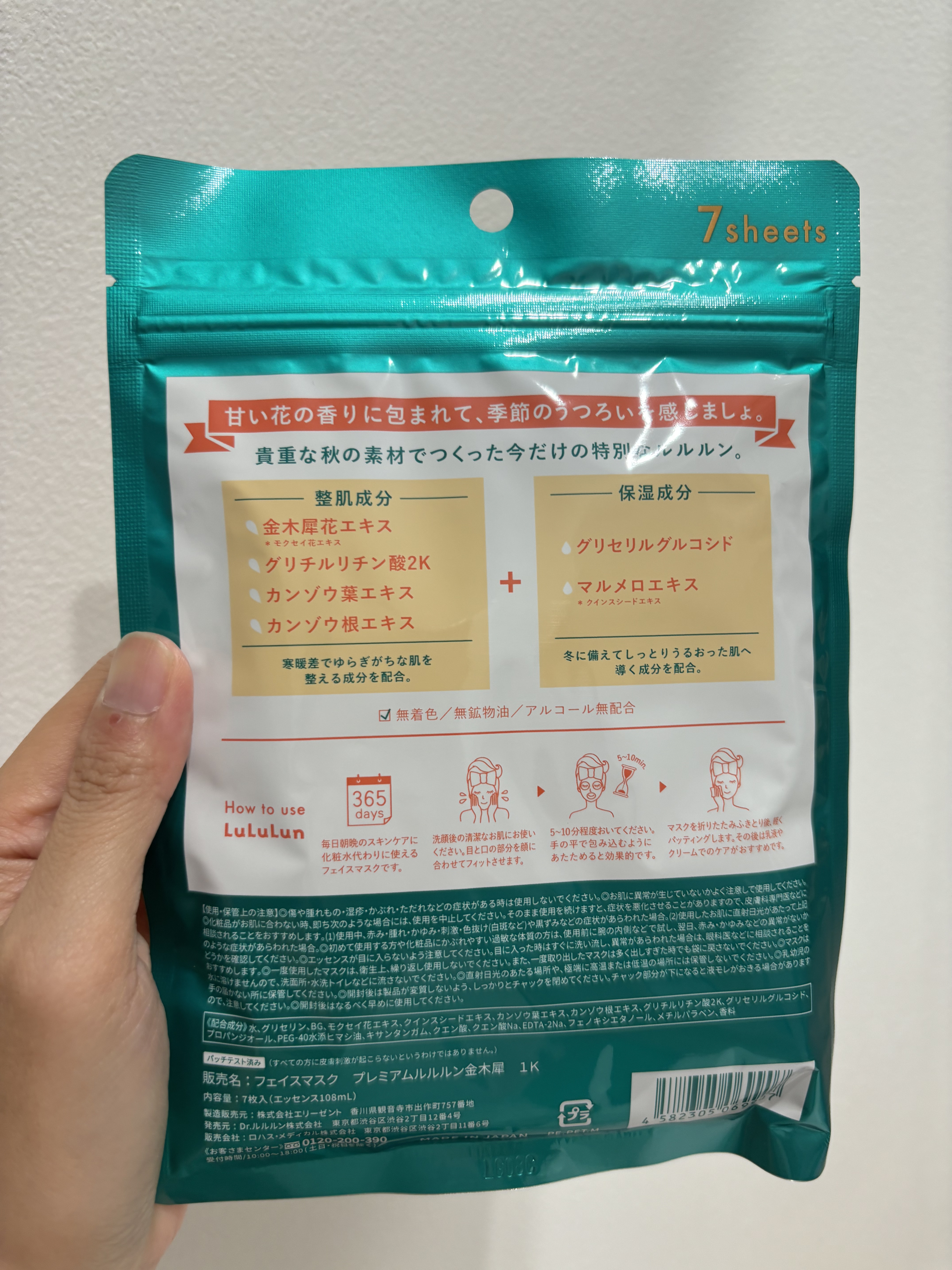 LuLuLunプレミアムルルルン金木犀キンモクセイの香り7枚入り×3袋¥1,320(税込)去年の9月頃に購入してた金木犀🏵季節限定っぽいので今年の秋も発売される感じ?なのかは分からんけど1袋だけ使って残りは友達にプレゼントした🎁🩷ルルルンマス...