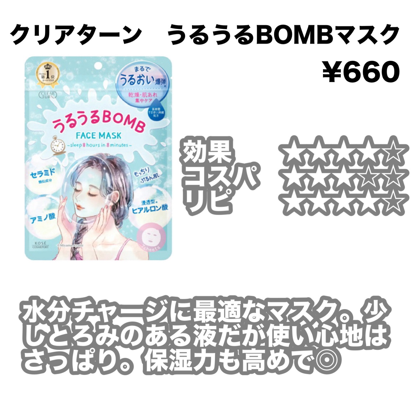 クリアターンうるうるBOMBマスク 7枚入り✼••┈┈••✼••┈┈••✼••┈┈••✼••┈┈••✼この製品の特徴は①超しっとり!「長時間うるおい持続処方」②心地よい眠りへ導くようなリラックスフローラルの香りつき(天然香料配合)③優しい使い...