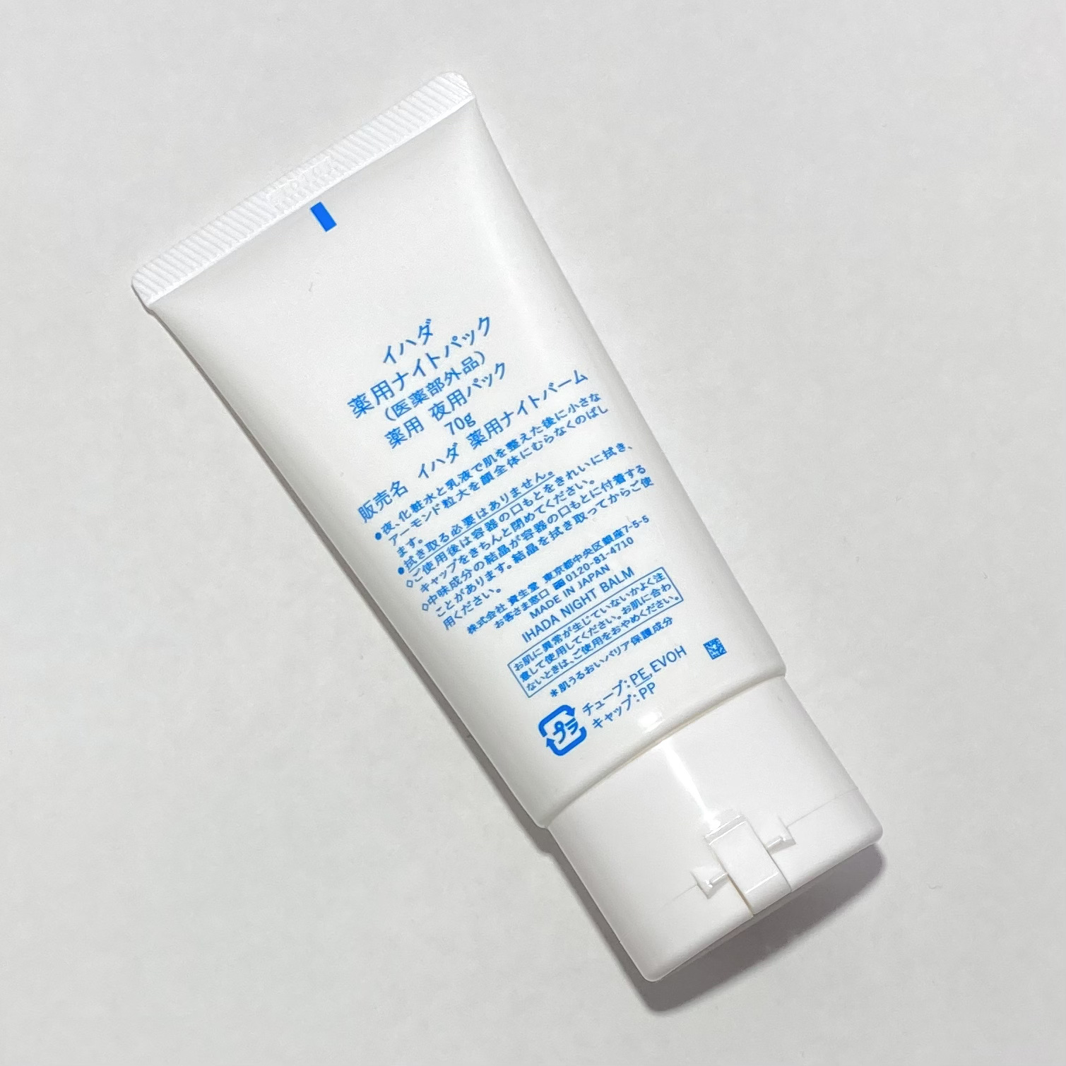 - 【医薬部外品】 新パッケージへリニューアル。 繰り返しがちな肌荒れ・乾燥を防ぐ、夜の集中ケアパックです。 やさしく肌に広がるクリーミーなバームのパックで、べたつかずに一晩中密封してうるおいが続き、翌朝なめらかな肌に整えます。 クリームのなめらかさとバームの密封力を実現したハイブリッドケア処方。 蓄積した、乾燥など日中に受けた肌ダメージ対策に、塗って寝るだけの簡単ケア。 2つの肌荒れ防止有効成分:トラネキサム酸、グリチルリチン酸ジカリウム配合 肌うるおいバリア保護成分:高精製ワセリン配合 うるおいバリア機能を整えながら、角層のすみずみまでうるおいで満たし、すこやかな環境に導きます。 敏感肌設計 ○厳選原料・成分配合 ○パラベン(防腐剤)無添加、アルコール(エチルアルコール)無添加 ○無香料、無着色、弱酸性〇アレルギーテスト済み・ニキビのもとになりにくい処方(全てのかたにアレルギーが起きない、また、ニキビができないわけではありません。) 販売名:イハダ 薬用ナイトバーム ※商品の改良や表示方法の変更などにより、実際の成分と一部異なる場合があります。実際の成分は商品の表示をご覧ください。