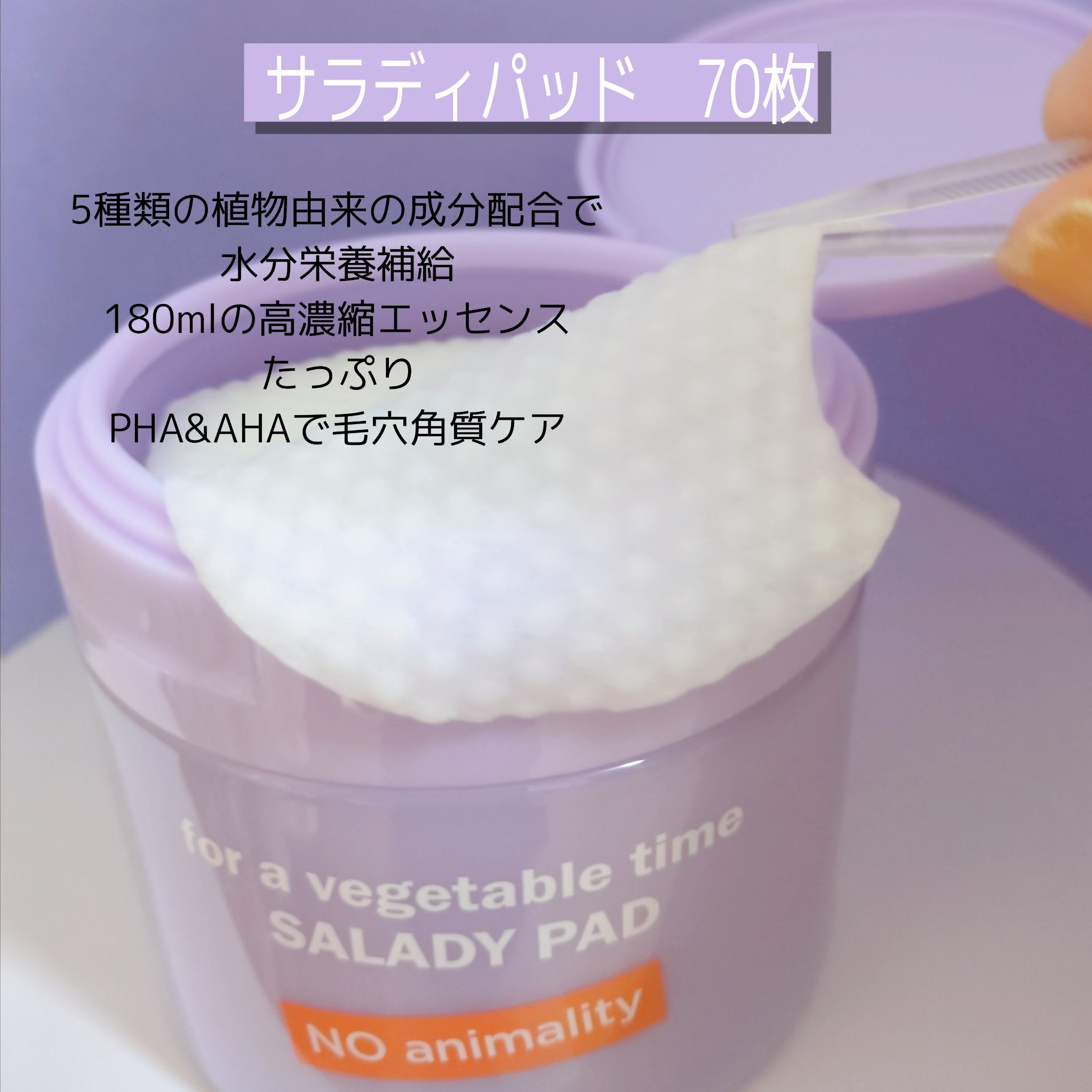 サラディパッドは分厚くてふかふか。 エンボス面がしっかり凸凹してるからささっと拭き取るだけでかなりさっぱりして気持ちいい。 ポアーテンクリームは滑らかで柔らかい質感。 毛穴ケアと水分補給だけじゃなく、プライマーにもなるから手持ちアイテム少なめで行きたい旅行や出張にも重宝してます🙆♀️✨ 使い心地が良くてもうふかふかのトナパしか使えなくなりそう🤤🌼