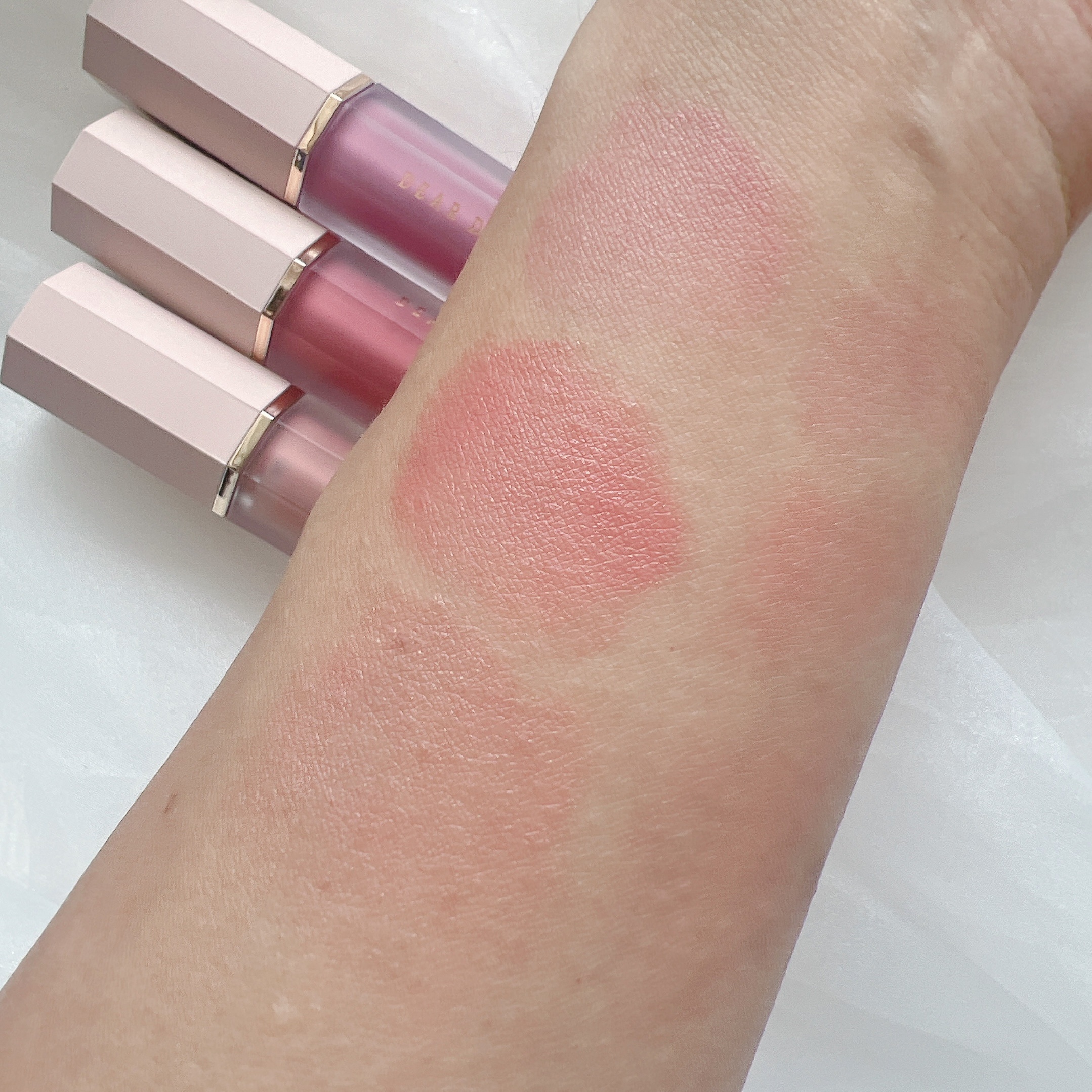 candydollケアオイルティントリップ.キャンディドールのガチレポ企画でもらいました❤️全色スウォッチ✨✨上から501,502,503,504,505だよ🌸.個人的には501がお気に入り😇❤️開発でも1番色味を決めるのが大変だったんだって...