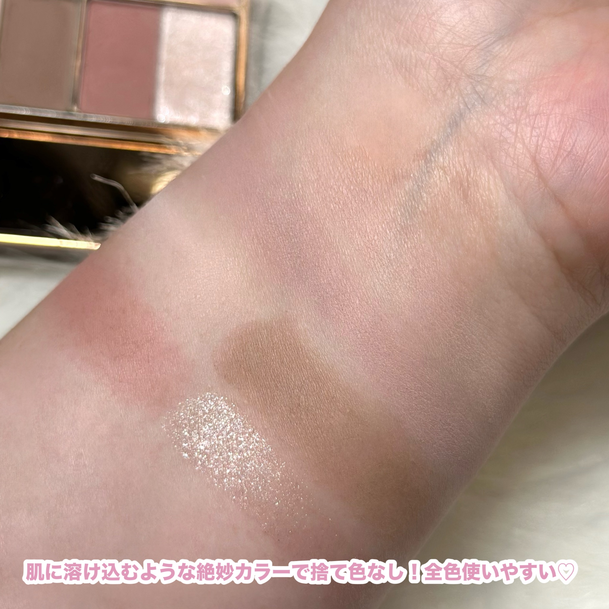 愛らしい6色をコンパクトにぎゅっと詰め込んだパレット。 このパレットで眉毛・アイシャドウ・チーク全部いけちゃう! 1000円台らしからぬこの高級感よ。 大きいミラーやチップもついて、パケもしっかりしていて安心感がすごい。 締め色のない全体的に淡いカラーが魅力。 特に私は上2色が気に入ってます。目元に使ってもほのかな陰影が出て盛れるし、チークに使っても可愛い。